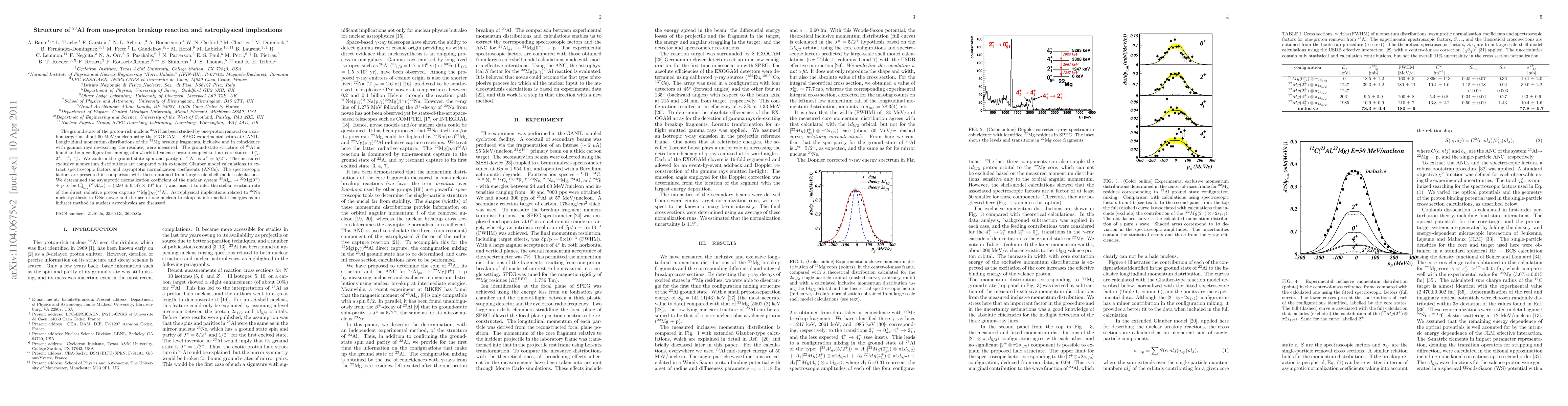 The ground state of the proton-rich nucleus 23Al has been studied by one-proton removal on a carbon target at about 50 MeV/nucleon using the EXOGAM + SPEG experimental setup at GANIL. Longitudinal momentum distributions of the 22Mg breakup fragments, inclusive and in coincidence with gamma rays de-exciting the residues, were measured. The ground-state structure of 23Al is found to be a configuration mixing of a d-orbital valence proton coupled to four core states - 0$^{+}_{gs}$, 2$^{+}_{1}$, 4$^{+}_{1}$, 4$^{+}_{2}$. We confirm the ground state spin and parity of 23Al as $J^{\pi} = 5/2^{+}$. The measured exclusive momentum distributions are compared with extended Glauber model calculations to extract spectroscopic factors and asymptotic normalization coefficients (ANCs). The spectroscopic factors are presented in comparison with those obtained from large-scale shell model calculations. We determined the asymptotic normalization coefficient of the nuclear system $^{23}$Al$_{gs}$ $\rightarrow$ $^{22}$Mg(0$^{+}$) + p to be $C^{2}_{d_{5/2}}$($^{23}Al_{gs}$) = (3.90 $\pm$ 0.44) $\times$ 10$^{3}$ fm$^{-1}$, and used it to infer the stellar reaction rate of the direct radiative proton capture $^{22}$Mg(p,$\gamma$)$^{23}$Al. Astrophysical implications related to $^{22}$Na nucleosynthesis in ONe novae and the use of one-nucleon breakup at intermediate energies as an indirect method in nuclear astrophysics are discussed.