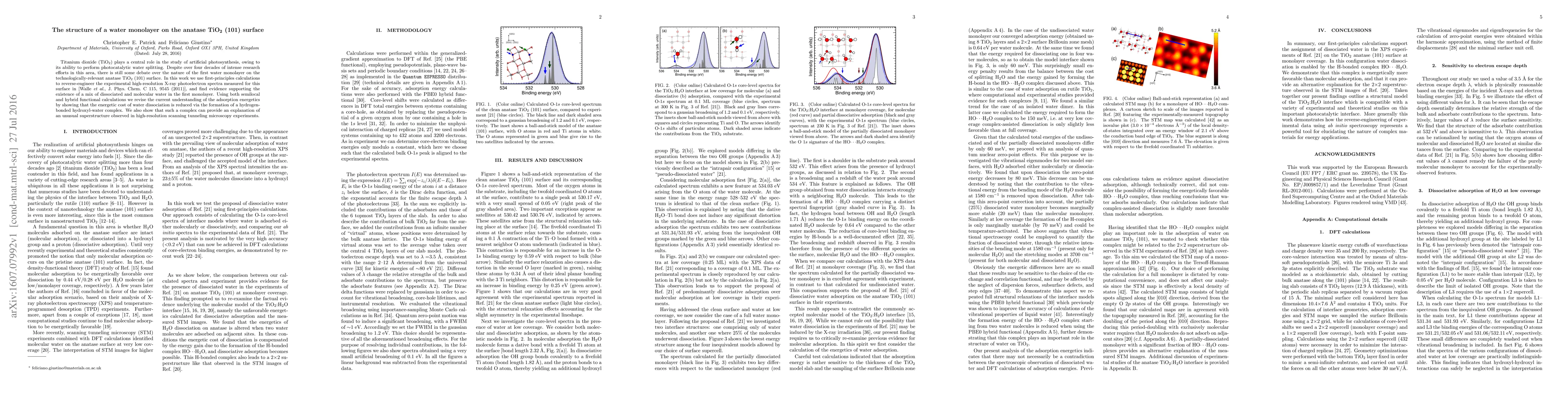 Titanium dioxide (TiO$_2$) plays a central role in the study of artificial photosynthesis, owing to its ability to perform photocatalytic water splitting. Despite over four decades of intense research efforts in this area, there is still some debate over the nature of the first water monolayer on the technologically-relevant anatase TiO$_2$ (101) surface. In this work we use first-principles calculations to reverse-engineer the experimental high-resolution X-ray photoelectron spectra measured for this surface in [Walle et al., J. Phys. Chem. C 115, 9545 (2011)], and find evidence supporting the existence of a mix of dissociated and molecular water in the first monolayer. Using both semilocal and hybrid functional calculations we revise the current understanding of the adsorption energetics by showing that the energetic cost of water dissociation is reduced via the formation of a hydrogen-bonded hydroxyl-water complex. We also show that such a complex can provide an explanation of an unusual superstructure observed in high-resolution scanning tunneling microscopy experiments.