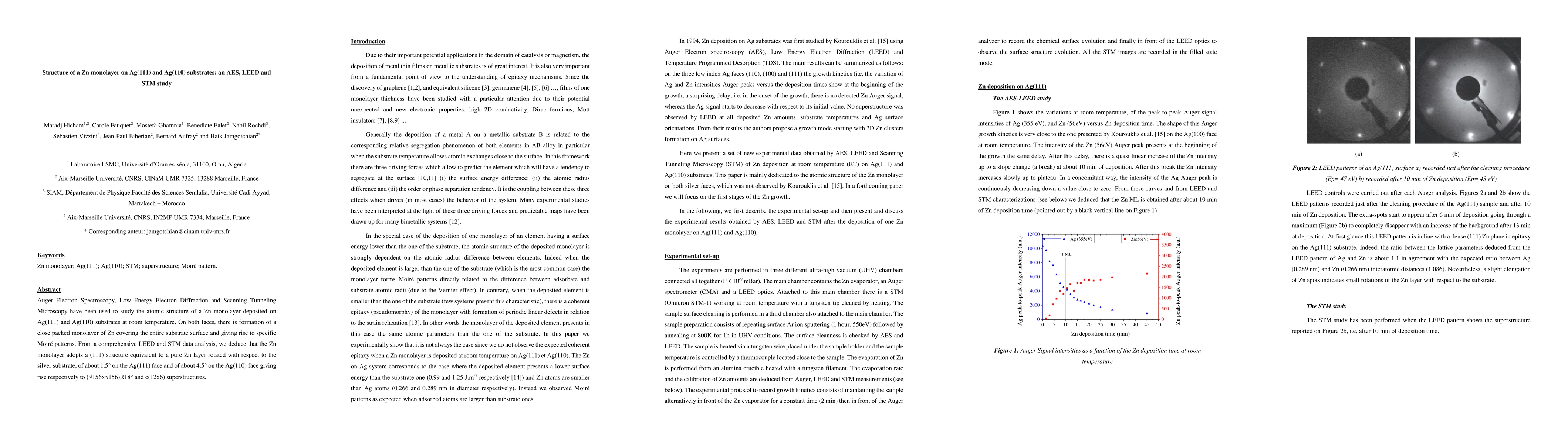 Auger Electron Spectroscopy, Low Energy Electron Diffraction and Scanning Tunneling Microscopy have been used to study the atomic structure of a Zn monolayer deposited on Ag(111) and Ag(110) substrates at room temperature. On both faces, there is formation of a close packed monolayer of Zn covering the entire substrate surface and giving rise to specific Moir{\'e} patterns. From a comprehensive LEED and STM data analysis, we deduce that the Zn monolayer adopts a (111) structure equivalent to a pure Zn layer rotated with respect to the silver substrate, of about $1.5^\circ$ on the Ag(111) face and of about $4.5^\circ$ on the Ag(110) face giving rise respectively to ($\sqrt{156}\times\sqrt{156})R18^\circ$ and c(12x6) superstructures.