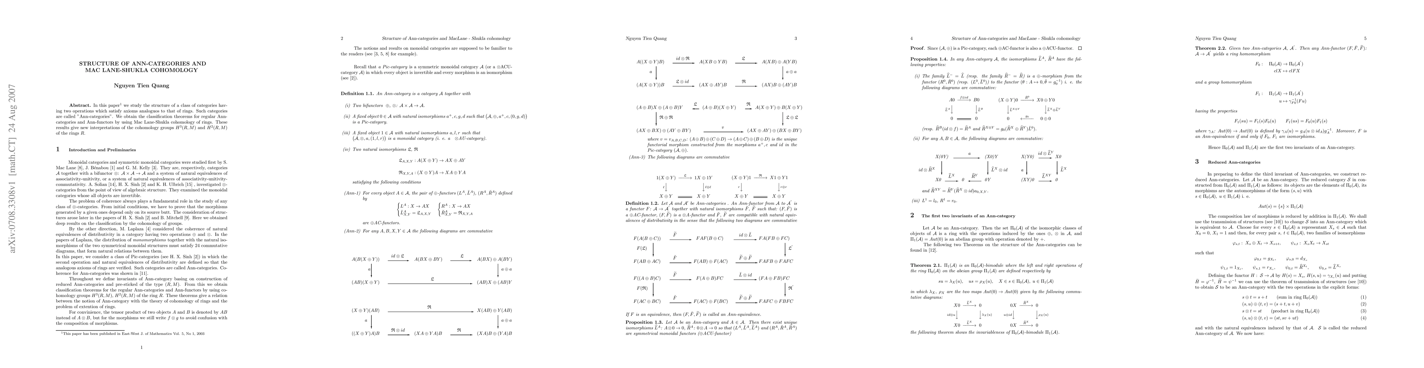 In this paper we study the structure of a class of categories having two operations which satisfy axioms analoguos to that of rings. Such categories are called "Ann - categories". We obtain the classification theorems for regular Ann - categories and Ann - functors by using Mac Lane - Shukla cohomology of rings. These results give new interpretations of the cohomology groups and of the rings