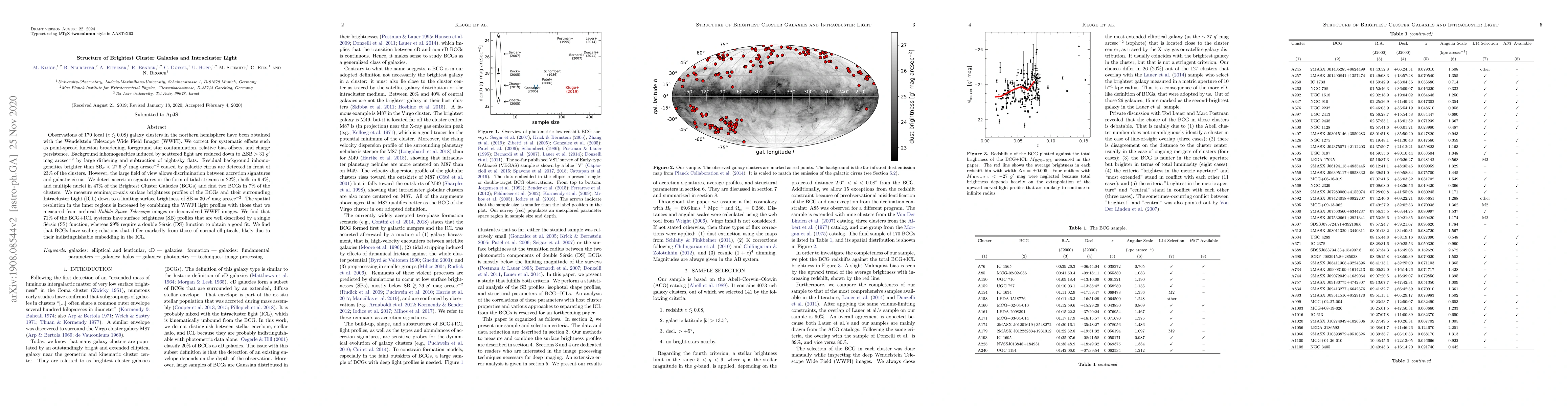 Observations of 170 local ($z\lesssim0.08$) galaxy clusters in the northern hemisphere have been obtained with the Wendelstein Telescope Wide Field Imager (WWFI). We correct for systematic effects such as point-spread function broadening, foreground star contamination, relative bias offsets, and charge persistence. Background inhomogeneities induced by scattered light are reduced down to $\Delta {\rm SB} > 31~g'$ mag arcsec$^{-2}$ by large dithering and subtraction of night-sky flats. Residual background inhomogeneities brighter than ${\rm SB}_{\sigma}< 27.6~g'$ mag arcsec$^{-2}$ caused by galactic cirrus are detected in front of 23% of the clusters. However, the large field of view allows discrimination between accretion signatures and galactic cirrus. We detect accretion signatures in the form of tidal streams in 22%, shells in 9.4%, and multiple nuclei in 47% of the Brightest Cluster Galaxies (BCGs) and find two BCGs in 7% of the clusters. We measure semimajor-axis surface brightness profiles of the BCGs and their surrounding Intracluster Light (ICL) down to a limiting surface brightness of ${\rm SB} = 30~g'$ mag arcsec$^{-2}$. The spatial resolution in the inner regions is increased by combining the WWFI light profiles with those that we measured from archival \textit{Hubble Space Telescope} images or deconvolved WWFI images. We find that 71% of the BCG+ICL systems have surface brightness (SB) profiles that are well described by a single S\'ersic (SS) function, whereas 29% require a double S\'ersic (DS) function to obtain a good fit. We find that BCGs have scaling relations that differ markedly from those of normal ellipticals, likely due to their indistinguishable embedding in the ICL.