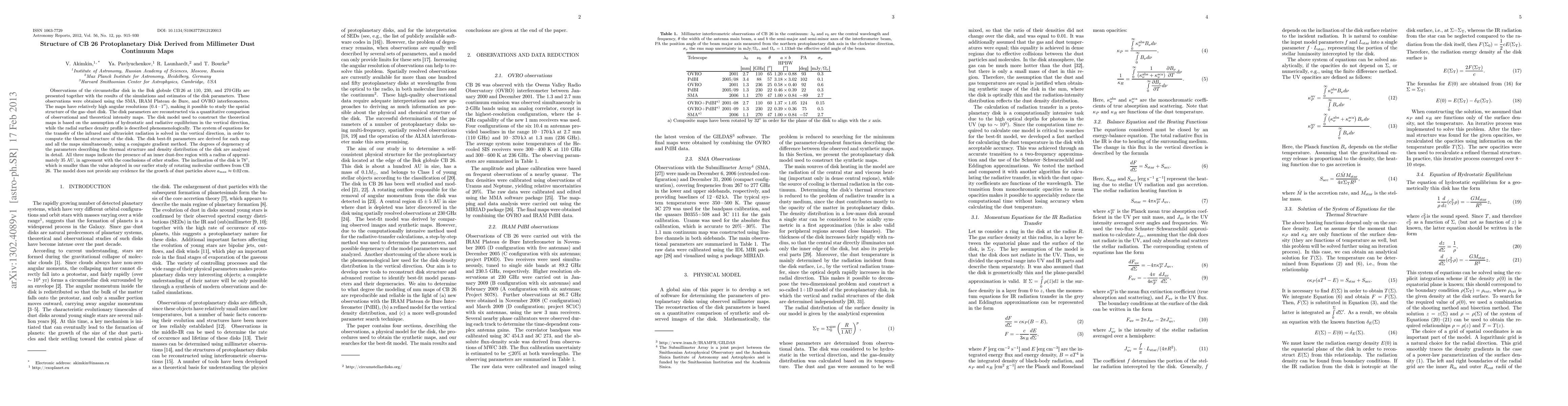 Observations of the circumstellar disk in the Bok globule CB 26 at 110, 230, and 270 GHz are presented together with the results of the simulations and estimates of the disk parameters. These observations were obtained using the SMA, IRAM Plateau de Bure, and OVRO interferometers. The maps have relatively high angular resolutions (0.4-1"), making it possible to study the spatial structure of the gas-dust disk. The disk parameters are reconstructed via a quantitative comparison of observational and theoretical intensity maps. The disk model used to construct the theoretical maps is based on the assumption of hydrostatic and radiative equilibrium in the vertical direction, while the radial surface density profile is described phenomenologically. The system of equations for the transfer of the infrared and ultraviolet radiation is solved in the vertical direction, in order to compute the thermal structure of the disk. The disk best-fit parameters are derived for each map and all the maps simultaneously, using a conjugate gradient method. The degrees of degeneracy of the parameters describing the thermal structure and density distribution of the disk are analyzed in detail. All three maps indicate the presence of an inner dust-free region with a radius of approximately 35 AU, in agreement with the conclusions of other studies. The inclination of the disk is 78 deg, which is smaller than the value adopted in our earlier study of rotating molecular outflows from CB 26. The model does not provide any evidence for the growth of dust particles above a_max=0.02 cm.