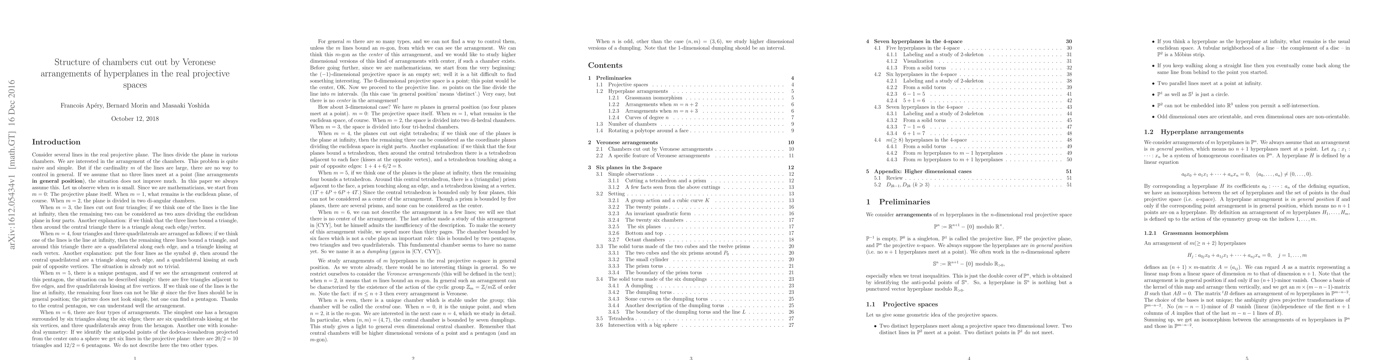 We study arrangements of $m$ hyperplanes in the $n$-dimensional real projective space, with a special focus on $m=n+3$ and $n=3$ or $n=4$.