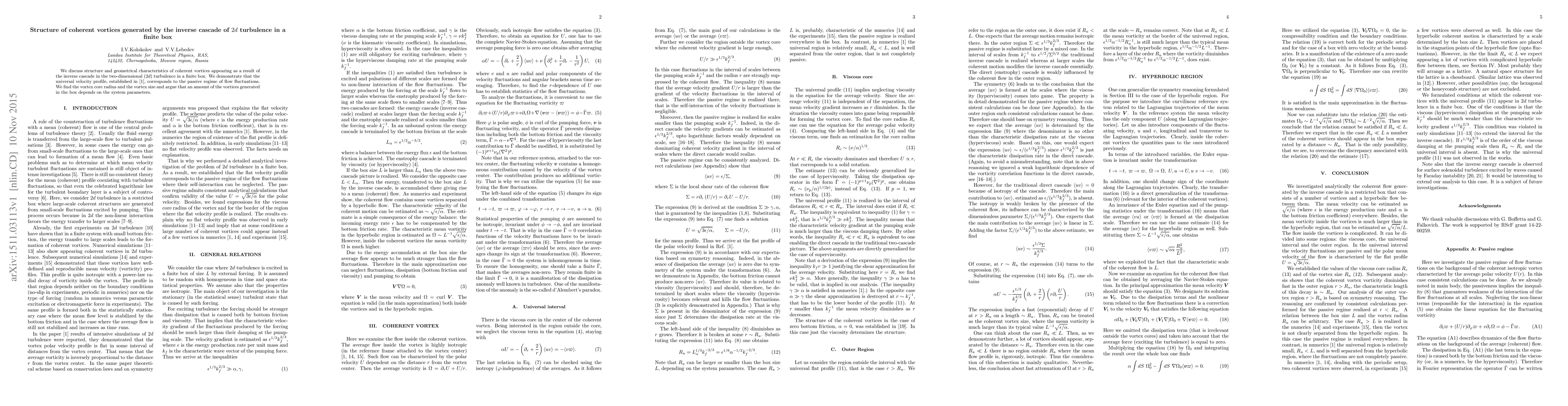 We discuss structure and geometrical characteristics of coherent vortices appearing as a result of the inverse cascade in the two-dimensional turbulence in a finite box. We demonstrate that the universal velocity profile, established previously, corresponds to the passive regime of flow fluctuations. We find the vortex core radius and the vortex size and argue that an amount of the vortices generated in the box depends on the system parameters.