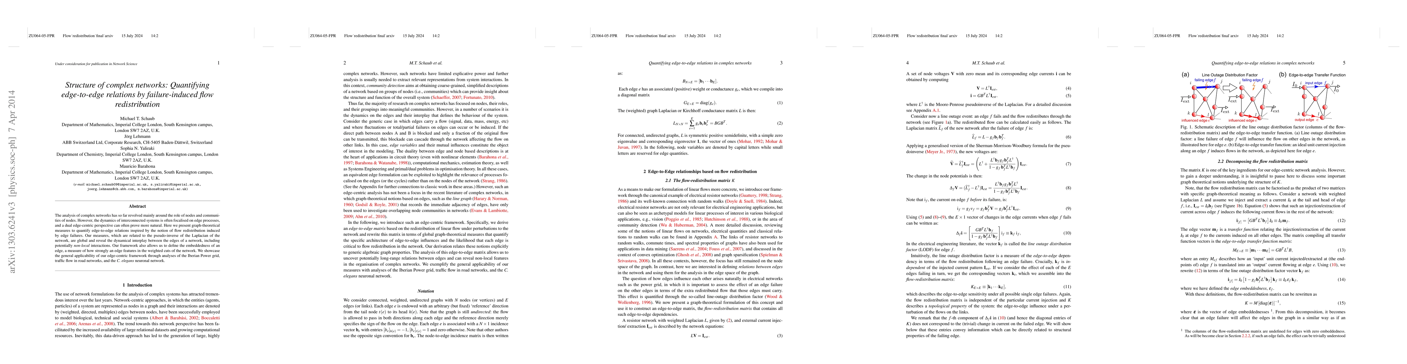 The analysis of complex networks has so far revolved mainly around the role of nodes and communities of nodes. However, the dynamics of interconnected systems is commonly focalised on edge processes, and a dual edge-centric perspective can often prove more natural. Here we present graph-theoretical measures to quantify edge-to-edge relations inspired by the notion of flow redistribution induced by edge failures. Our measures, which are related to the pseudo-inverse of the Laplacian of the network, are global and reveal the dynamical interplay between the edges of a network, including potentially non-local interactions. Our framework also allows us to define the embeddedness of an edge, a measure of how strongly an edge features in the weighted cuts of the network. We showcase the general applicability of our edge-centric framework through analyses of the Iberian Power grid, traffic flow in road networks, and the C. elegans neuronal network.