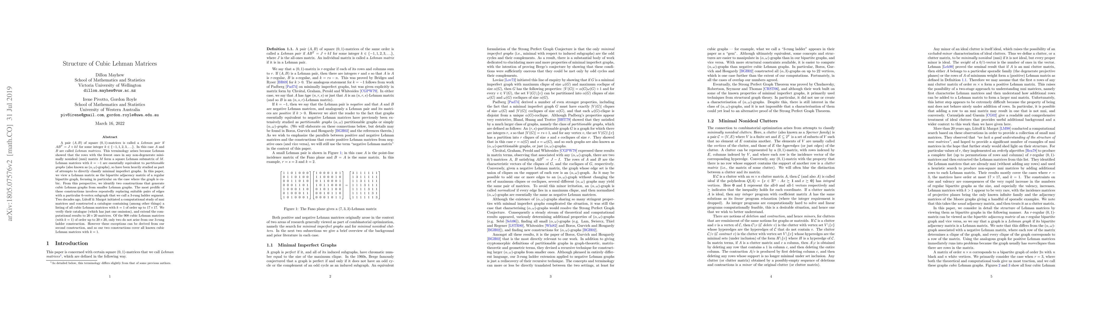 This paper explores Lehman matrices, specifically cubic Lehman graphs, and identifies two constructions generating these graphs from smaller Lehman graphs. The authors verify and extend a catalogue of cubic Lehman matrices with $k=1$, showing that all known matrices up to $20 \times 20$ can be derived from their constructions.