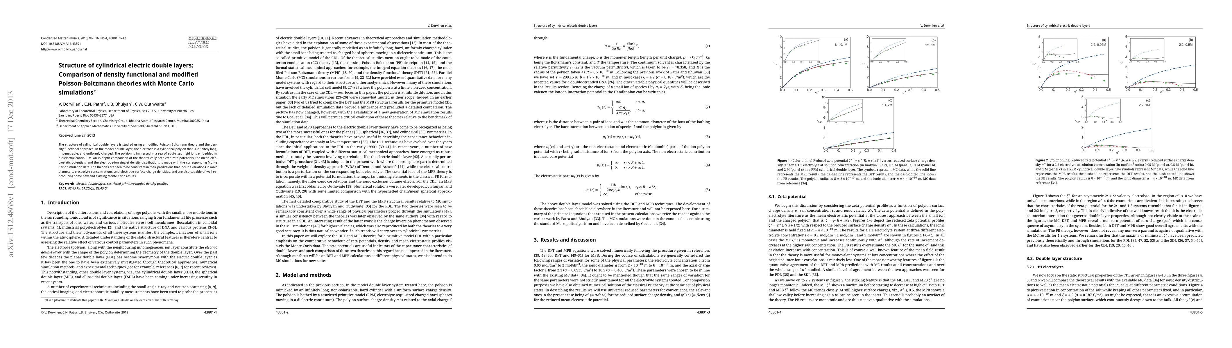 This paper compares density functional and modified Poisson-Boltzmann theories for cylindrical electric double layers against Monte Carlo simulations, finding consistent predictions of zeta potentials, electrostatic potentials, and ion distributions across varying ionic diameters, electrolyte concentrations, and surface charge densities.