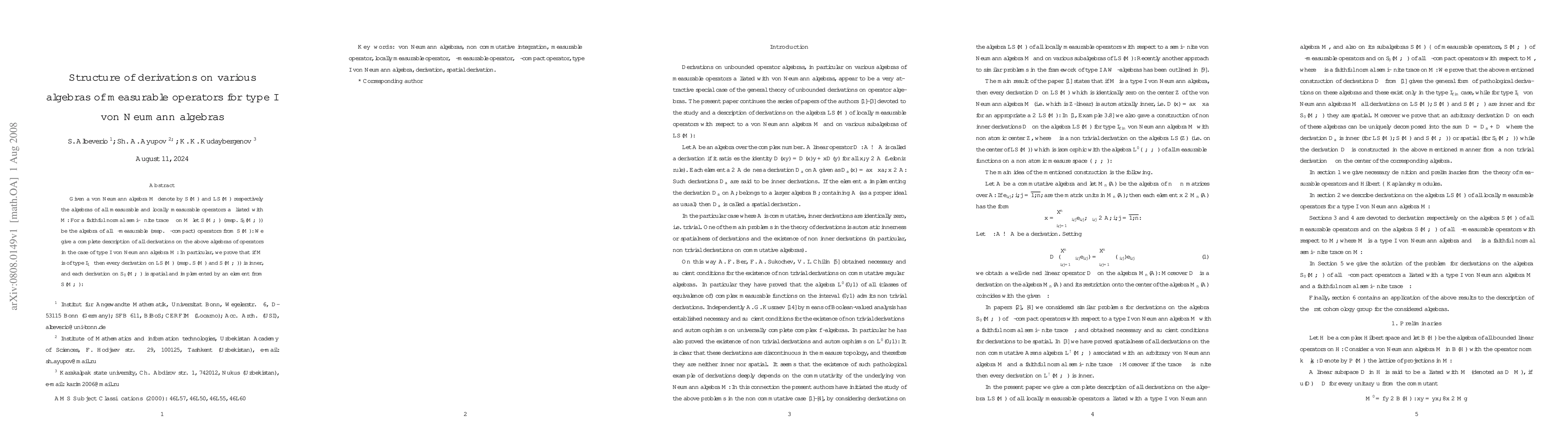 This paper provides a comprehensive analysis of derivations within various algebras of measurable operators affiliated with type I von Neumann algebras, showing that for type I$_∞$ algebras, derivations on certain subalgebras are either inner or spatial and implemented by elements from the corresponding algebras.