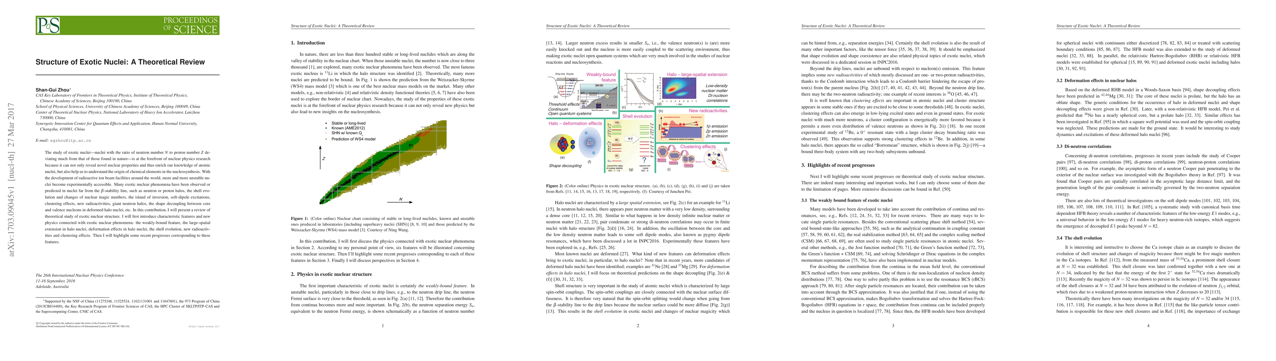 The study of exotic nuclei---nuclei with the ratio of neutron number $N$ to proton number $Z$ deviating much from that of those found in nature---is at the forefront of nuclear physics research because it can not only reveal novel nuclear properties and thus enrich our knowledge of atomic nuclei, but also help us to understand the origin of chemical elements in the nucleosynthesis. With the development of radioactive ion beam facilities around the world, more and more unstable nuclei become experimentally accessible. Many exotic nuclear phenomena have been observed or predicted in nuclei far from the $\beta$-stability line, such as neutron or proton halos, the shell evolution and changes of nuclear magic numbers, the island of inversion, soft-dipole excitations, clustering effects, new radioactivities, giant neutron halos, the shape decoupling between core and valence nucleons in deformed halo nuclei, etc. In this contribution, I will present a review of theoretical study of exotic nuclear structure. I will first introduce characteristic features and new physics connected with exotic nuclear phenomena: the weakly-bound feature, the large-spatial extension in halo nuclei, deformation effects in halo nuclei, the shell evolution, new radioactivities and clustering effects. Then I will highlight some recent progresses corresponding to these features.