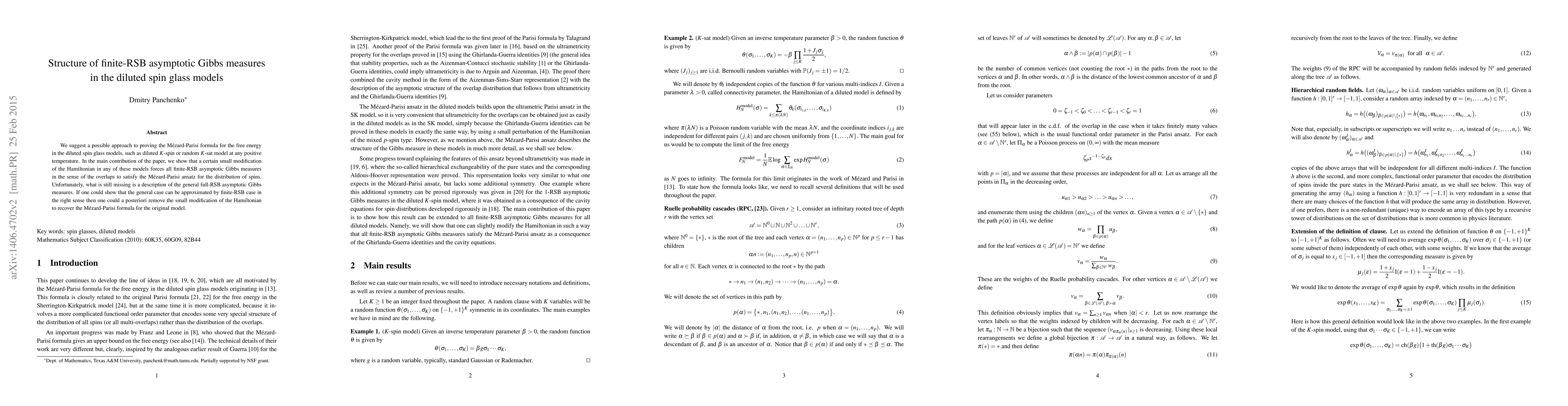 We suggest a possible approach to proving the M\'ezard-Parisi formula for the free energy in the diluted spin glass models, such as diluted K-spin or random K-sat model at any positive temperature. In the main contribution of the paper, we show that a certain small modification of the Hamiltonian in any of these models forces all finite-RSB asymptotic Gibbs measures in the sense of the overlaps to satisfy the M\'ezard-Parisi ansatz for the distribution of spins. Unfortunately, what is still missing is a description of the general full-RSB asymptotic Gibbs measures. If one could show that the general case can be approximated by finite-RSB case in the right sense then one could a posteriori remove the small modification of the Hamiltonian to recover the M\'ezard-Parisi formula for the original model.
