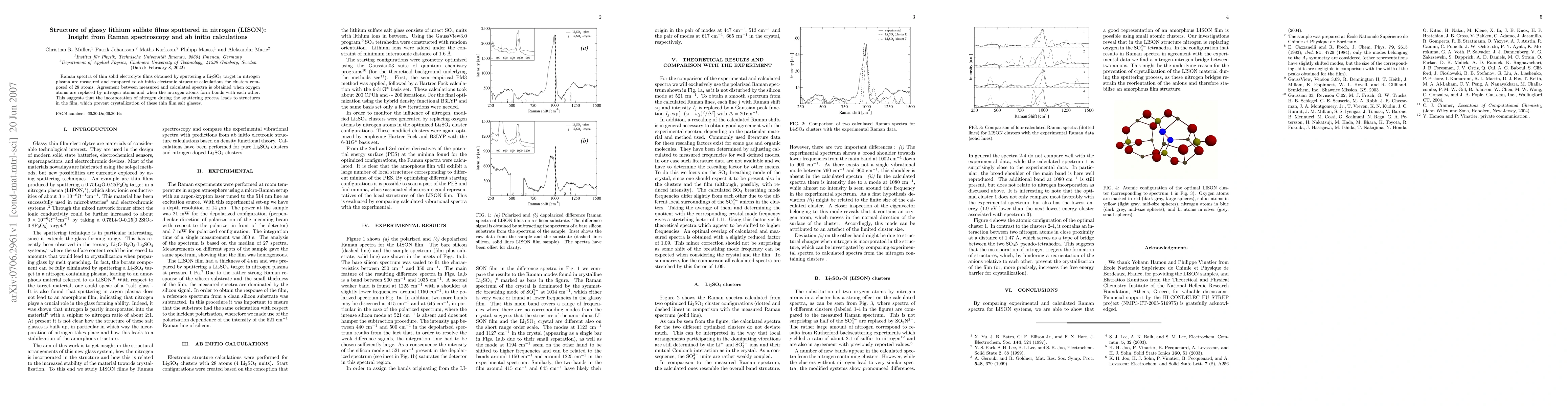 Raman spectra of thin solid electrolyte films obtained by sputtering a lithium sulfate target in nitrogen plasma are measured and compared to ab initio electronic structure calculations for clusters composed of 28 atoms. Agreement between measured and calculated spectra is obtained when oxygen atoms are replaced by nitrogen atoms and when the nitrogen atoms form bonds with each other. This suggests that the incorporation of nitrogen during the sputtering process leads to structures in the film, which prevent crystallization of these thin film salt glasses.