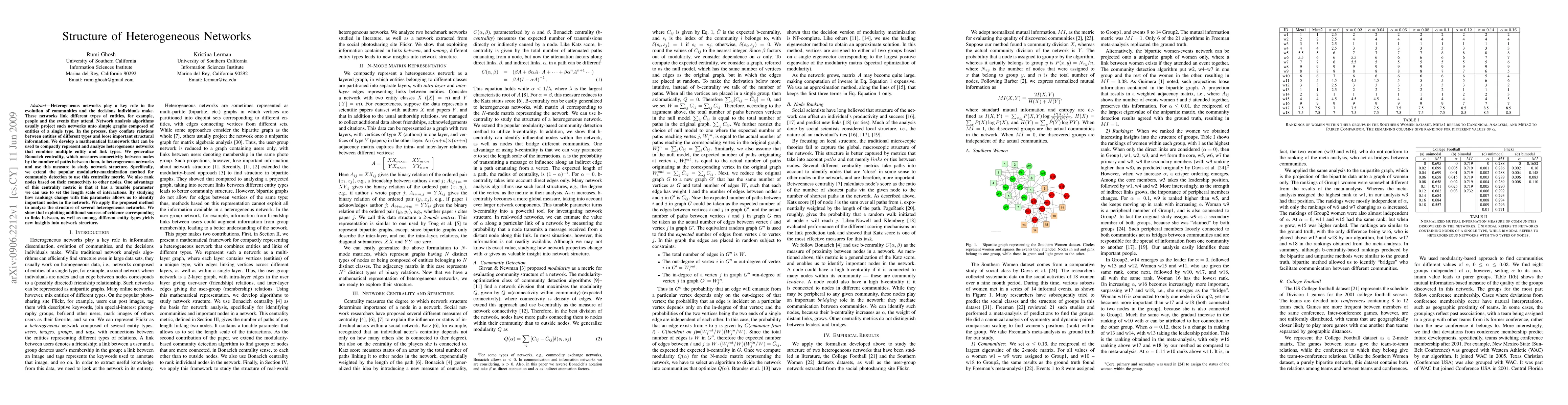 Heterogeneous networks play a key role in the evolution of communities and the decisions individuals make. These networks link different types of entities, for example, people and the events they attend. Network analysis algorithms usually project such networks unto simple graphs composed of entities of a single type. In the process, they conflate relations between entities of different types and loose important structural information. We develop a mathematical framework that can be used to compactly represent and analyze heterogeneous networks that combine multiple entity and link types. We generalize Bonacich centrality, which measures connectivity between nodes by the number of paths between them, to heterogeneous networks and use this measure to study network structure. Specifically, we extend the popular modularity-maximization method for community detection to use this centrality metric. We also rank nodes based on their connectivity to other nodes. One advantage of this centrality metric is that it has a tunable parameter we can use to set the length scale of interactions. By studying how rankings change with this parameter allows us to identify important nodes in the network. We apply the proposed method to analyze the structure of several heterogeneous networks. We show that exploiting additional sources of evidence corresponding to links between, as well as among, different entity types yields new insights into network structure.
