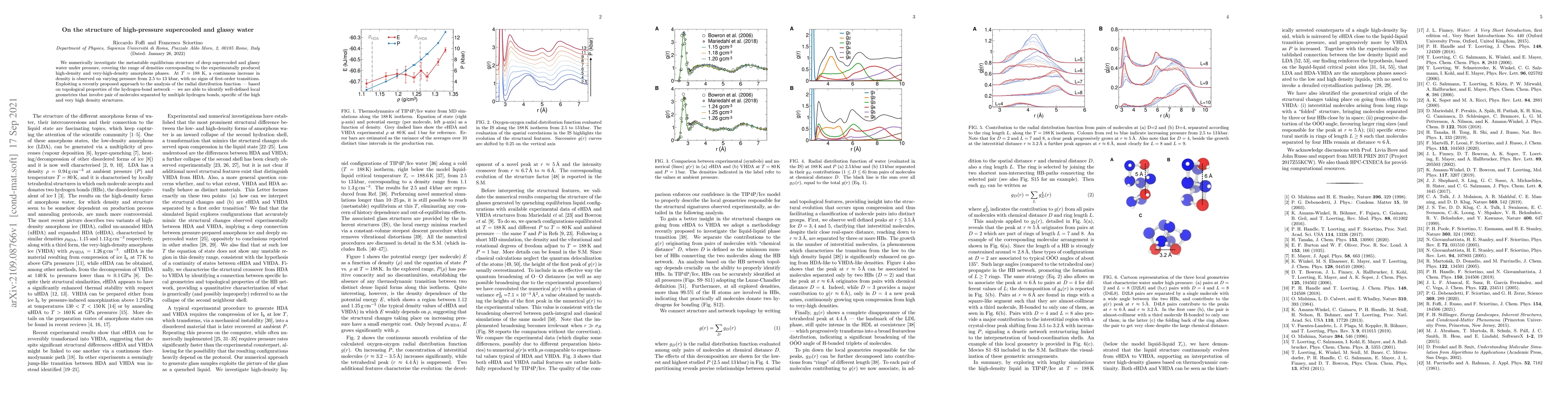 This research numerically investigates the structure of supercooled and glassy water under high pressure, revealing continuous density increase without first-order transitions. It identifies unique local geometries involving pairs of molecules separated by multiple hydrogen bonds, characteristic of high-density amorphous phases.