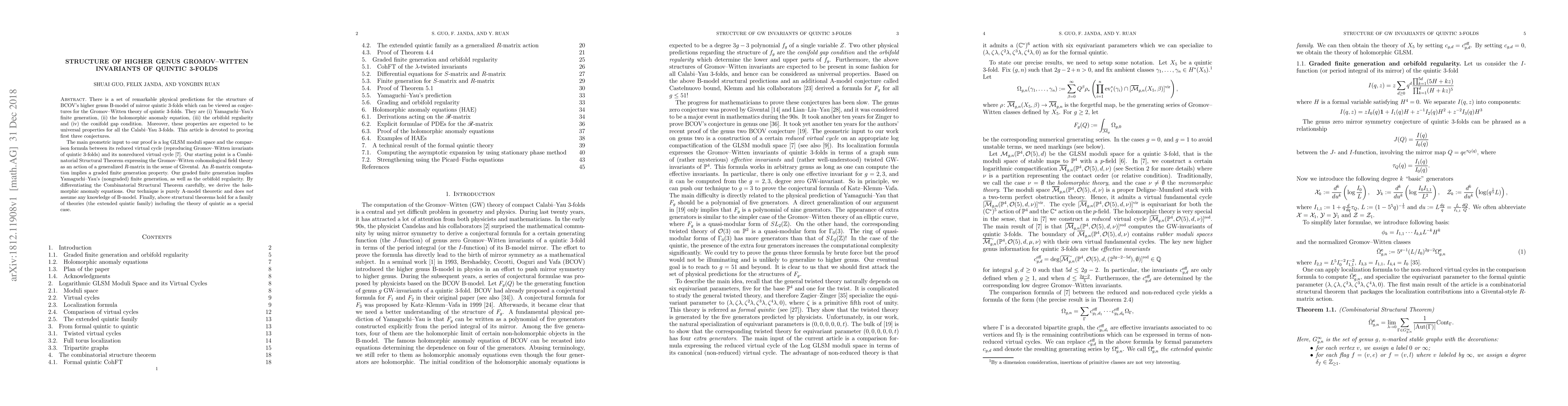 There is a set of remarkable physical predictions for the structure of BCOV's higher genus B-model of mirror quintic 3-folds which can be viewed as conjectures for the Gromov-Witten theory of quintic 3-folds. They are (i) Yamaguchi--Yau's finite generation, (ii) the holomorphic anomaly equation, (iii) the orbifold regularity and (iv) the conifold gap condition. Moreover, these properties are expected to be universal properties for all the Calabi-Yau 3-folds. This article is devoted to proving first three conjectures. The main geometric input to our proof is a log GLSM moduli space and the comparison formula between its reduced virtual cycle (reproducing Gromov--Witten invariants of quintic 3-folds) and its nonreduced virtual cycle. Our starting point is a Combinatorial Structural Theorem expressing the Gromov-Witten cohomological field theory as an action of a generalized $R$-matrix in the sense of Givental. An $R$-matrix computation implies a graded finite generation property. Our graded finite generation implies Yamaguchi-Yau's (nongraded) finite generation, as well as the orbifold regularity. By differentiating the Combinatorial Structural Theorem carefully, we derive the holomorphic anomaly equations. Our technique is purely A-model theoretic and does not assume any knowledge of B-model. Finally, above structural theorems hold for a family of theories (the extended quintic family) including the theory of quintic as a special case.