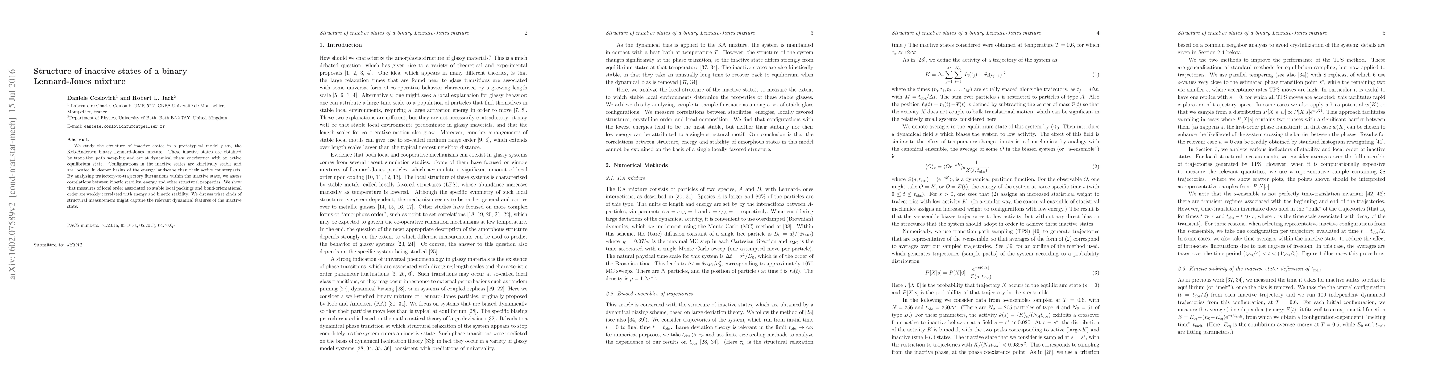 We study the structure of inactive states in a prototypical model glass, the Kob-Andersen binary Lennard-Jones mixture. These inactive states are obtained by transition path sampling and are at dynamical phase coexistence with an active equilibrium state. Configurations in the inactive states are kinetically stable and are located in deeper basins of the energy landscape than their active counterparts. By analyzing trajectory-to-trajectory fluctuations within the inactive state, we assess correlations between kinetic stability, energy and other structural properties. We show that measures of local order associated to stable local packings and bond-orientational order are weakly correlated with energy and kinetic stability. We discuss what kinds of structural measurement might capture the relevant dynamical features of the inactive state.