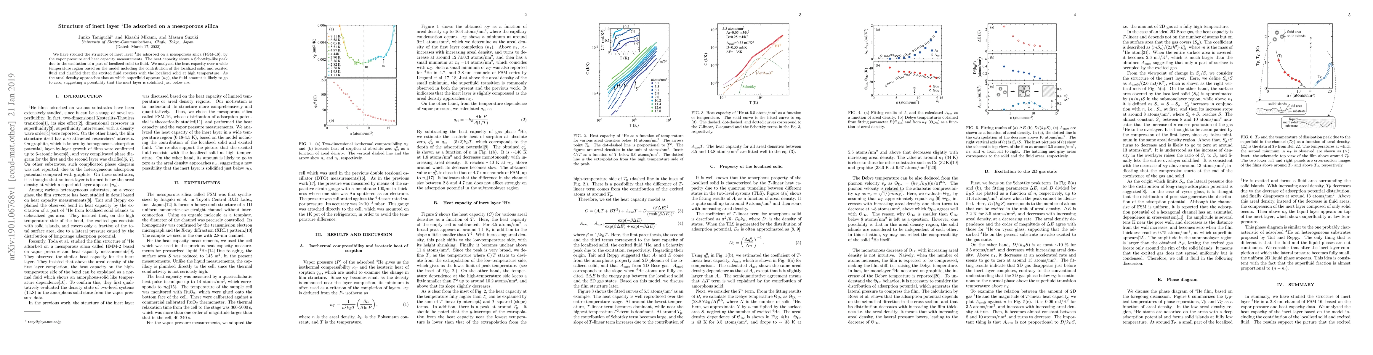 This study investigates the structure of adsorbed 4He on mesoporous silica (FSM-16) via vapor pressure and heat capacity measurements, revealing a Schottky-like peak indicating a transition from localized solid to fluid phases. The analysis suggests that the excited fluid coexists with the localized solid at high temperatures, and near the superfluid transition density, the fluid phase diminishes, hinting at solidification of the inert layer.
