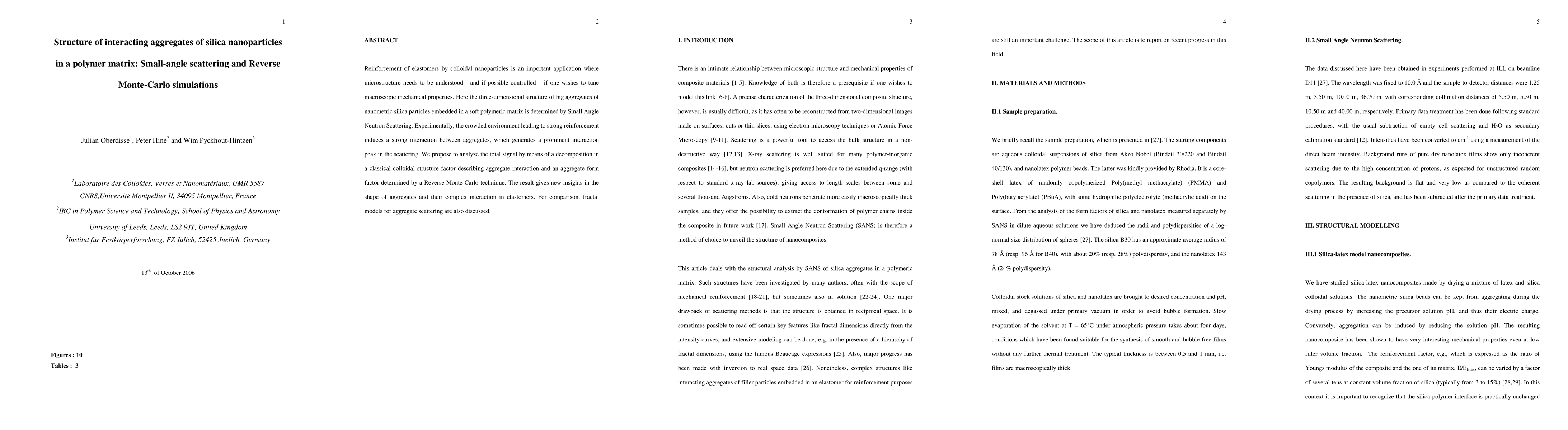 This study investigates the three-dimensional structure of silica nanoparticle aggregates in a polymer matrix using Small Angle Neutron Scattering and Reverse Monte Carlo simulations. The research reveals the complex interactions between these aggregates, providing new insights into their shape and reinforcing effects on the macroscopic mechanical properties of elastomers.