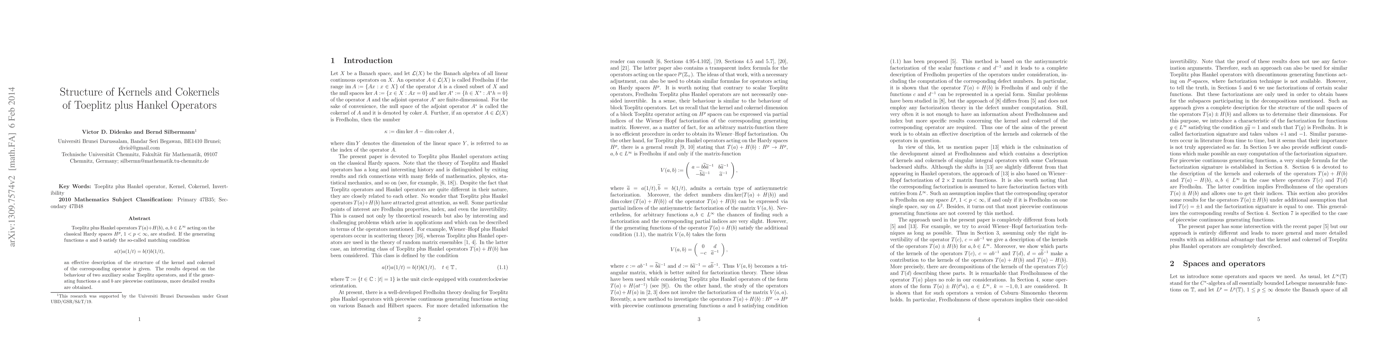 This paper investigates the structure of kernels and cokernels for Toeplitz plus Hankel operators $T(a)+H(b)$ under the matching condition $a(t) a(1/t) = b(t) b(1/t)$. It provides an effective description of these structures based on the behavior of two auxiliary scalar Toeplitz operators, with more detailed results for piecewise continuous generating functions.