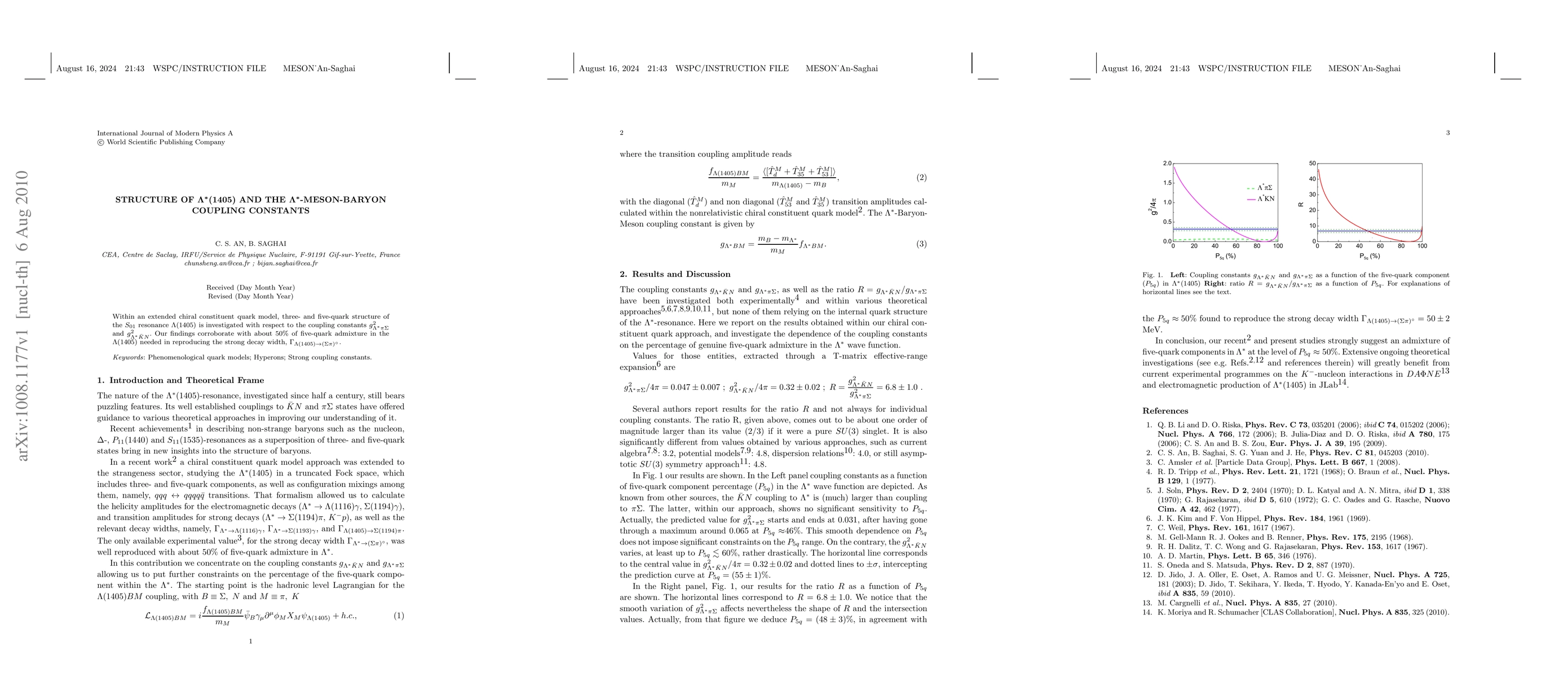This paper investigates the $\Lambda(1405)$ resonance within an extended chiral constituent quark model, finding a significant five-quark structure (about 50%) that matches the observed strong decay width, $\Gamma_{\Lambda(1405)\to (\Sigma \pi)^\circ}$. The study also examines the $\lambda^*$-meson-baryon coupling constants.