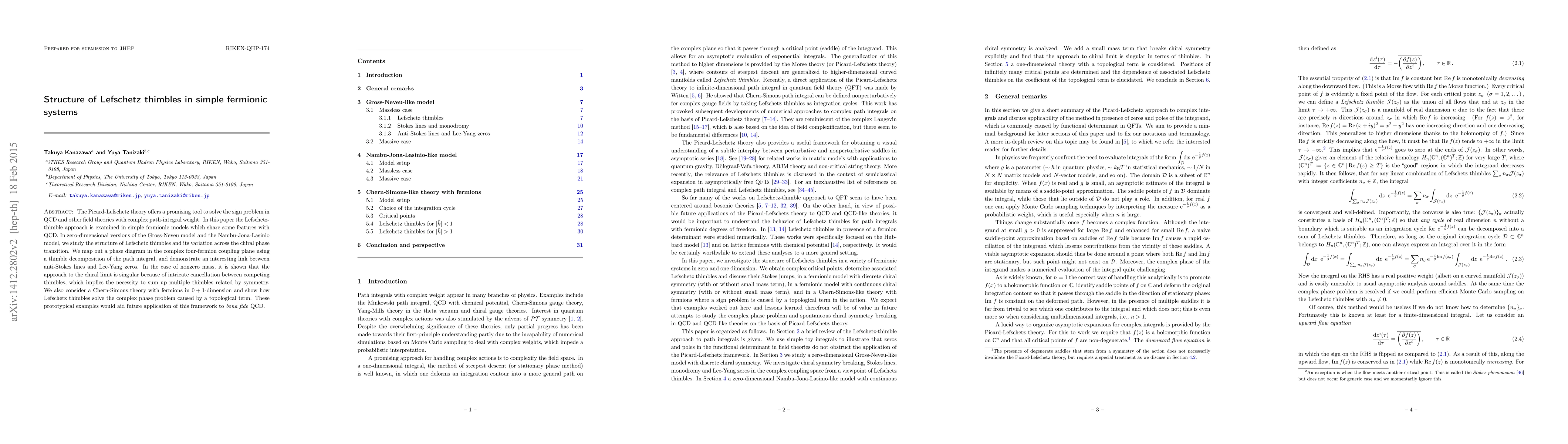 The Picard-Lefschetz theory offers a promising tool to solve the sign problem in QCD and other field theories with complex path-integral weight. In this paper the Lefschetz-thimble approach is examined in simple fermionic models which share some features with QCD. In zero-dimensional versions of the Gross-Neveu model and the Nambu-Jona-Lasinio model, we study the structure of Lefschetz thimbles and its variation across the chiral phase transition. We map out a phase diagram in the complex four-fermion coupling plane using a thimble decomposition of the path integral, and demonstrate an interesting link between anti-Stokes lines and Lee-Yang zeros. In the case of nonzero mass, it is shown that the approach to the chiral limit is singular because of intricate cancellation between competing thimbles, which implies the necessity to sum up multiple thimbles related by symmetry. We also consider a Chern-Simons theory with fermions in $0+1$-dimension and show how Lefschetz thimbles solve the complex phase problem caused by a topological term. These prototypical examples would aid future application of this framework to bona fide QCD.