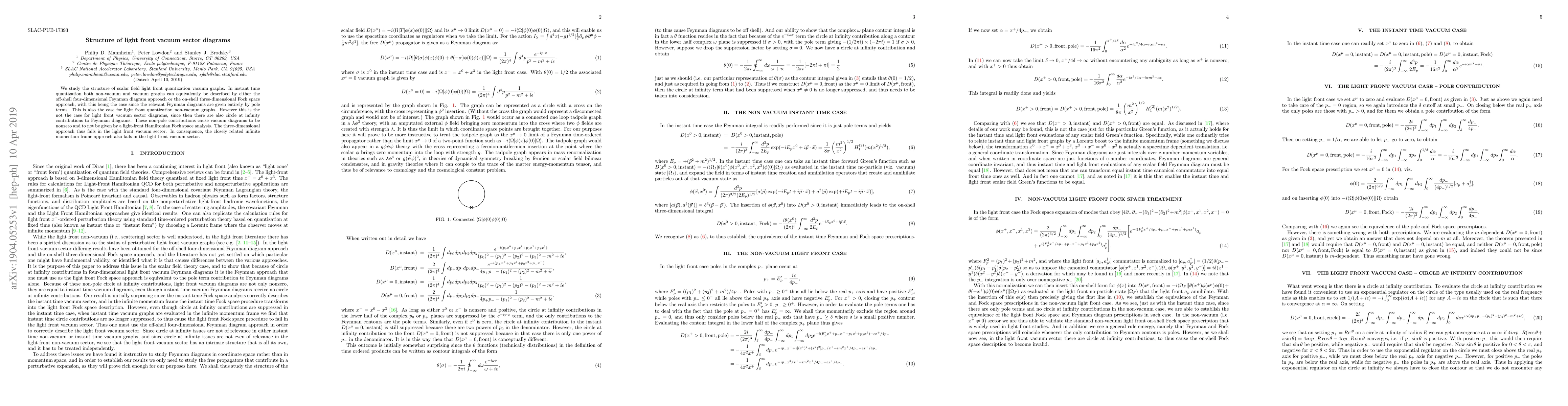 We study the structure of scalar field light front quantization vacuum graphs. In instant time quantization both non-vacuum and vacuum graphs can equivalently be described by either the off-shell four-dimensional Feynman diagram approach or the on-shell three-dimensional Fock space approach, with this being the case since the relevant Feynman diagrams are given entirely by pole terms. This is also the case for light front quantization non-vacuum graphs. However this is the not the case for light front vacuum sector diagrams, since then there are also circle at infinity contributions to Feynman diagrams. These non-pole contributions cause vacuum diagrams to be nonzero and to not be given by a light-front Hamiltonian Fock space analysis. The three-dimensional approach thus fails in the light front vacuum sector. In consequence, the closely related infinite momentum frame approach also fails in the light front vacuum sector.