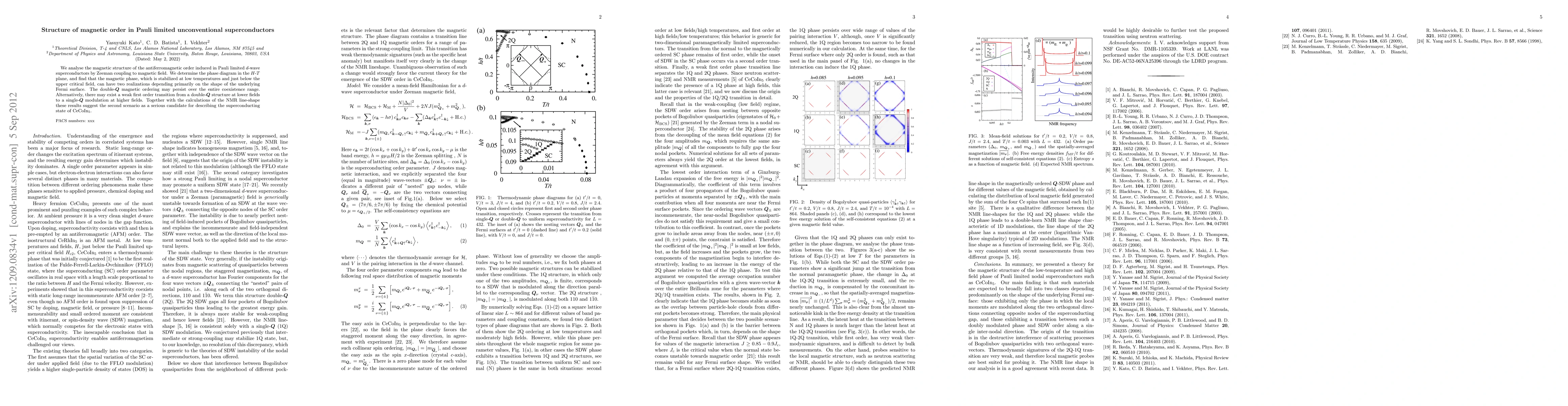 This paper investigates the magnetic order in Pauli limited d-wave superconductors under Zeeman coupling, revealing a complex phase diagram with two possible magnetic phase realizations based on the Fermi surface shape. The study suggests a weak first-order transition from double-Q to single-Q modulation, supported by NMR line-shape calculations, as a plausible model for CeCoIn5.