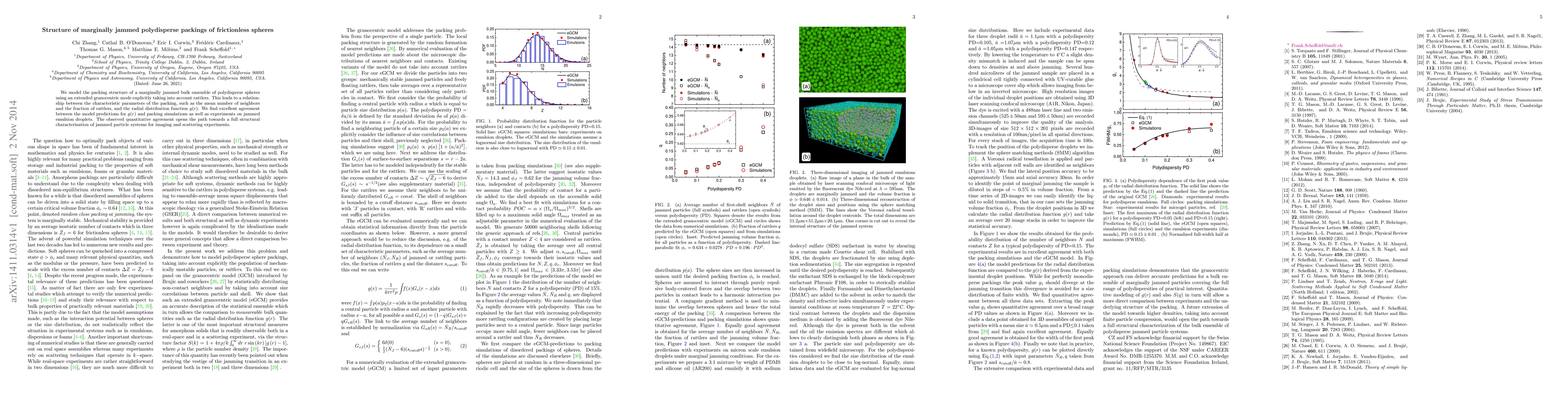 The research employs an extended granocentric model (eGCM) to analyze the packing structure of marginally jammed polydisperse spheres, considering rattlers explicitly. The model relates packing parameters like mean neighbors and rattler fraction to the radial distribution function g(r).