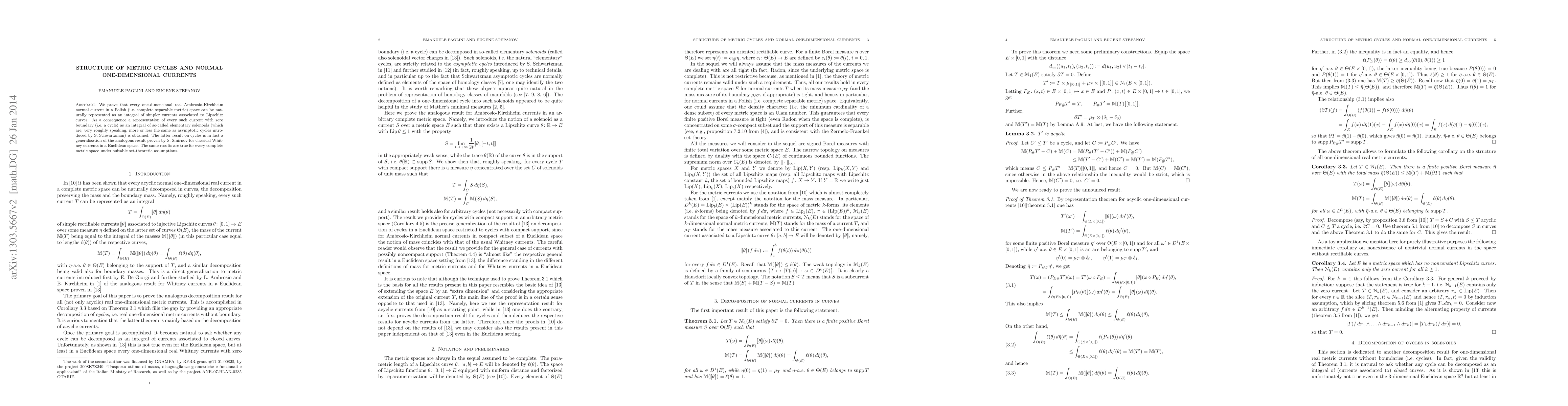 We prove that every one-dimensional real Ambrosio-Kirchheim normal current in a Polish (i.e. complete separable metric) space can be naturally represented as an integral of simpler currents associated to Lipschitz curves. As a consequence a representation of every such current with zero boundary (i.e. a cycle) as an integral of so-called elementary solenoids (which are, very roughly speaking, more or less the same as asymptotic cycles introduced by S. Schwartzman)is obtained. The latter result on cycles is in fact a generalization of the analogous result proven by S. Smirnov for classical Whitney currents in a Euclidean space. The same results are true for every complete metric space under suitable set-theoretic assumptions.