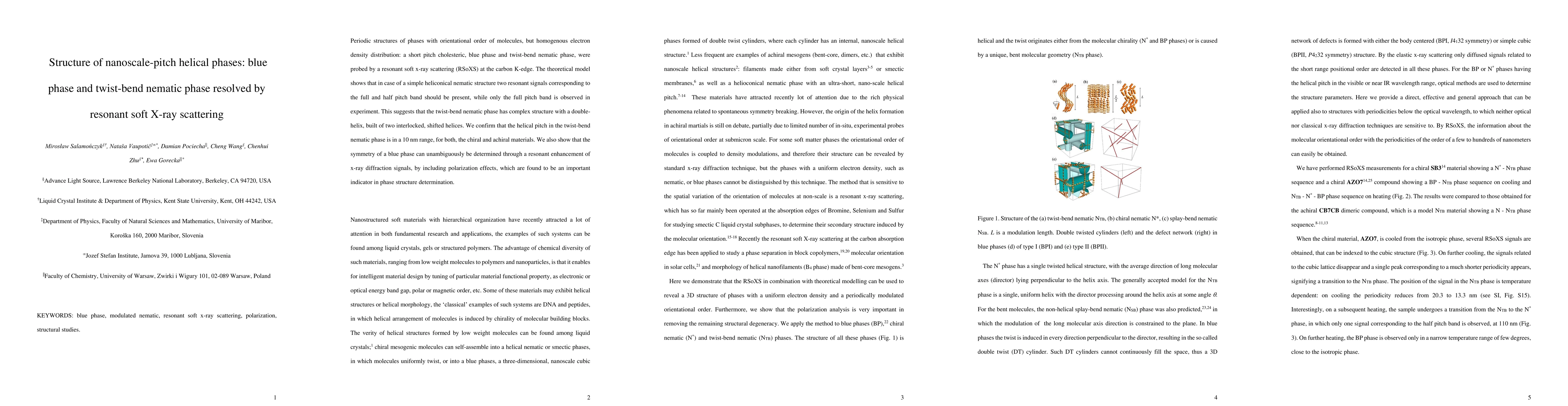 This paper investigates the nanoscale helical structures of blue phase and twist-bend nematic phases using resonant soft X-ray scattering. The study reveals a complex double-helix structure in the twist-bend nematic phase and confirms the helical pitch in the 10 nm range, while also highlighting the importance of polarization effects in determining blue phase symmetry.