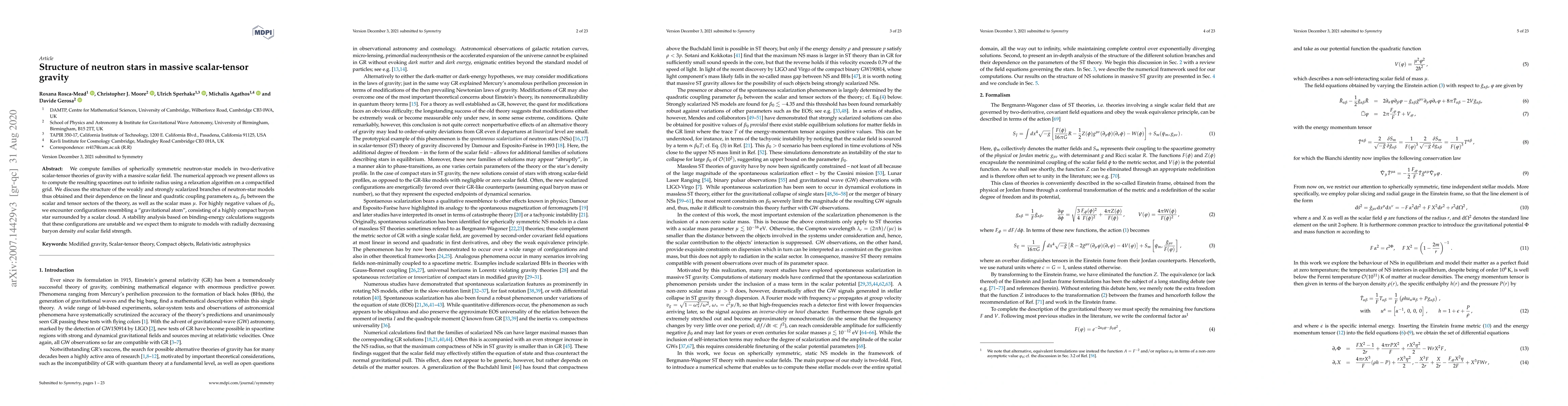 We compute families of spherically symmetric neutron-star models in two-derivative scalar-tensor theories of gravity with a massive scalar field. The numerical approach we present allows us to compute the resulting spacetimes out to infinite radius using a relaxation algorithm on a compactified grid. We discuss the structure of the weakly and strongly scalarized branches of neutron-star models thus obtained and their dependence on the linear and quadratic coupling parameters $\alpha_0$, $\beta_0$ between the scalar and tensor sectors of the theory, as well as the scalar mass $\mu$. For highly negative values of $\beta_0$, we encounter configurations resembling a "gravitational atom", consisting of a highly compact baryon star surrounded by a scalar cloud. A stability analysis based on binding-energ calculations suggests that these configurations are unstable and we expect them to migrate to models with radially decreasing baryon density {\it and} scalar field strength.