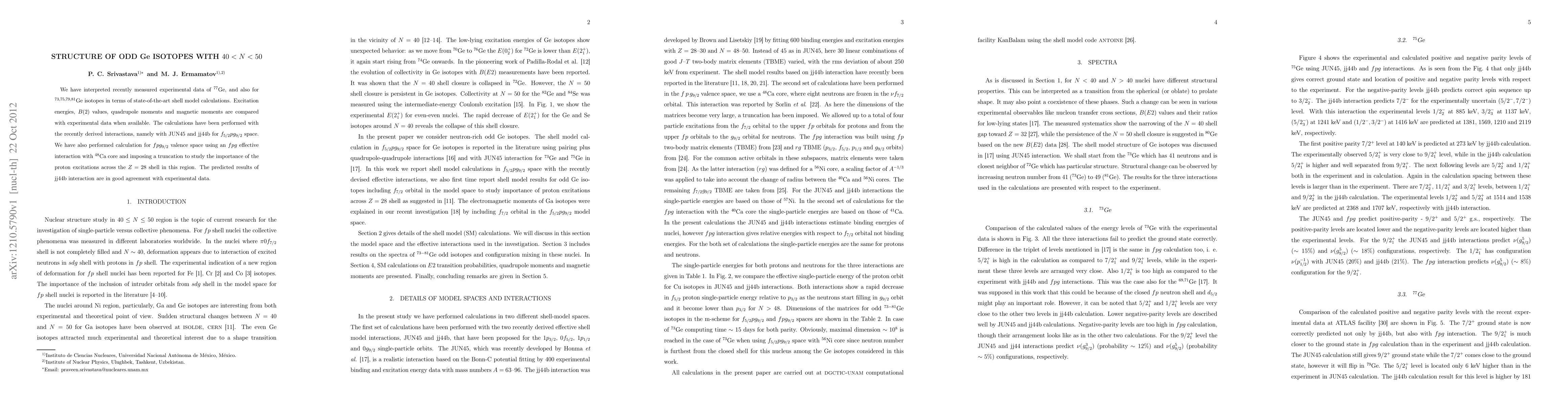 This study interprets experimental data for odd Ge isotopes with neutron numbers between 40 and 50 using advanced shell model calculations, specifically the JUN45 and jj44b interactions. The results, including excitation energies and magnetic moments, show good agreement with available experimental data, highlighting the importance of proton excitations across the Z=28 shell.
