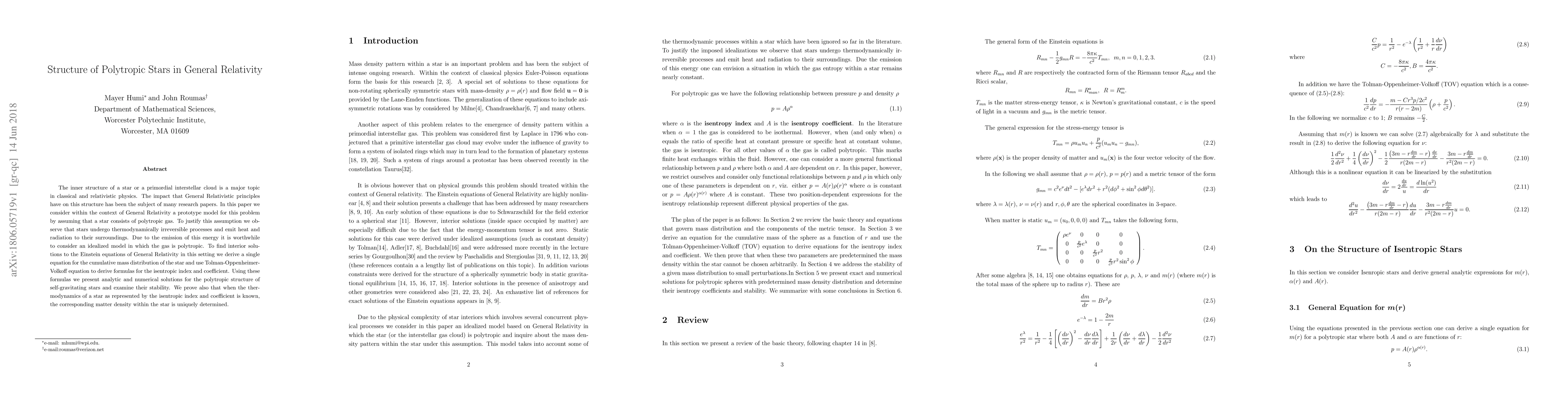 The inner structure of a star or a primordial interstellar cloud is a major topic in classical and relativistic physics. The impact that General Relativistic principles have on this structure has been the subject of many research papers. In this paper we consider within the context of General Relativity a prototype model for this problem by assuming that a star consists of polytropic gas. To justify this assumption we observe that stars undergo thermodynamically irreversible processes and emit heat and radiation to their surroundings. Due to the emission of this energy it is worthwhile to consider an idealized model in which the gas is polytropic. To find interior solutions to the Einstein equations of General Relativity in this setting we derive a single equation for the cumulative mass distribution of the star and use Tolman-Oppenheimer-Volkoff equation to derive formulas for the isentropic index and coefficient. Using these formulas we present analytic and numerical solutions for the polytropic structure of self-gravitating stars and examine their stability. We prove also that when the thermodynamics of a star as represented by the isentropic index and coefficient is known, the corresponding matter density within the star is uniquely determined.