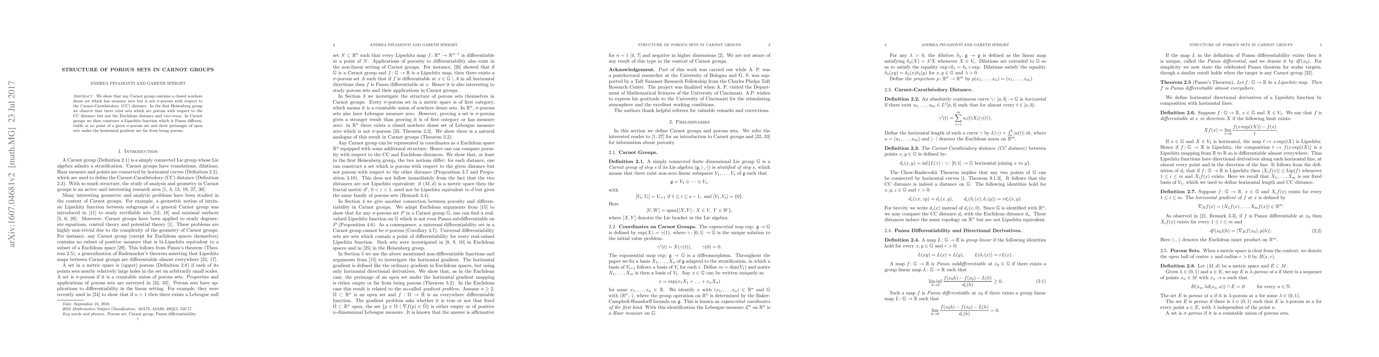 We show that any Carnot group contains a closed nowhere dense set which has measure zero but is not $\sigma$-porous with respect to the Carnot-Carath\'eodory (CC) distance. In the first Heisenberg group we observe that there exist sets which are porous with respect to the CC distance but not the Euclidean distance and vice-versa. In Carnot groups we then construct a Lipschitz function which is Pansu differentiable at no point of a given $\sigma$-porous set and show preimages of open sets under the horizontal gradient are far from being porous.