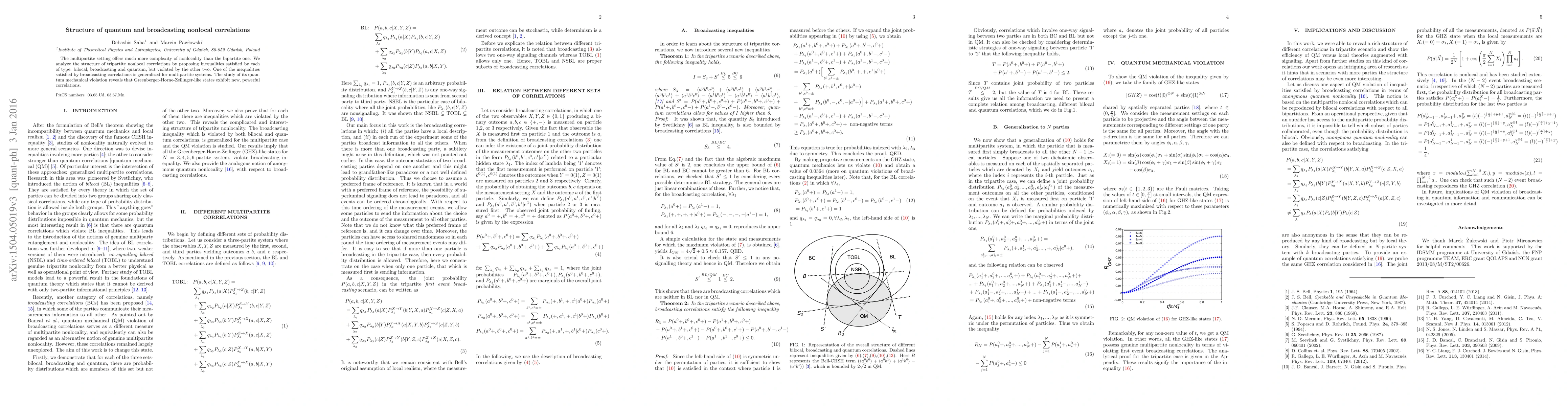 The multipartite setting offers much more complexity of nonlocality than the bipartite one. We analyze the structure of tripartite nonlocal correlations by proposing inequalities satisfied by each type: bilocal, broadcasting and quantum, but violated by the other two. One of the inequalities satisfied by broadcasting correlations is generalized for multipartite systems. The study of its quantum mechanical violation reveals that Greenberger-Horne-Zeilinger-like states exhibit new, powerful correlations.