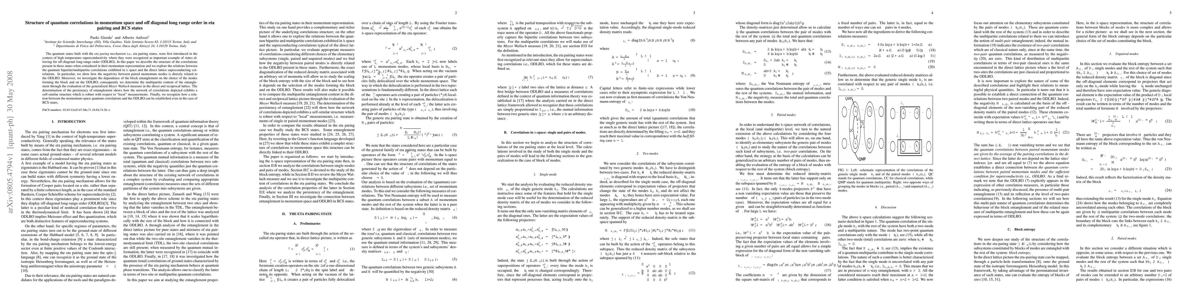 This paper investigates quantum correlations in eta pairing states and BCS states, focusing on momentum space representations and off-diagonal long-range order (ODLRO). It reveals the connection between momentum-mode negativity and ODLRO, and explores how entanglement's multipartite nature relates to lattice superconducting correlations, showing a self-similar structure robust to local measurements.