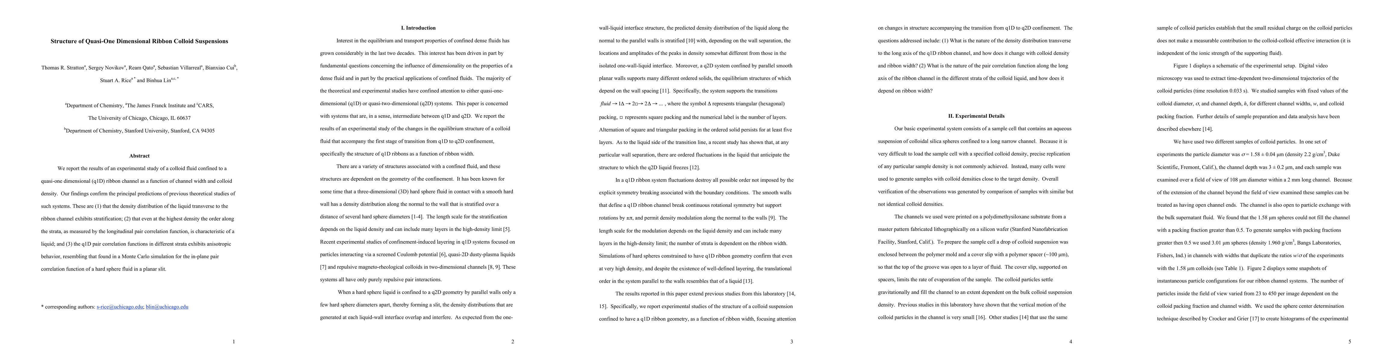 This study experimentally investigates quasi-one-dimensional ribbon colloid suspensions, confirming theoretical predictions of stratified density distribution, liquid-like order, and anisotropic q1D pair correlation functions resembling hard sphere fluids in planar slits.
