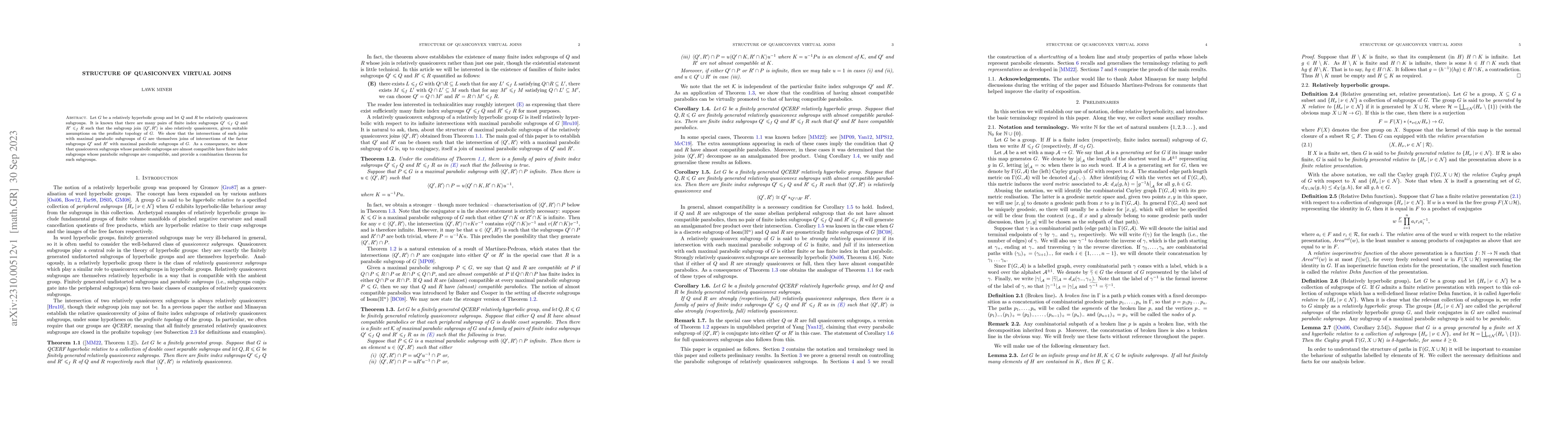 This paper investigates the structure of quasiconvex virtual joins in relatively hyperbolic groups, demonstrating that intersections of such joins with maximal parabolic subgroups are themselves joins of intersections of factor subgroups with these subgroups. It also proves that quasiconvex subgroups with almost compatible parabolic subgroups have finite index subgroups with compatible parabolic subgroups, and provides a combination theorem for these subgroups.