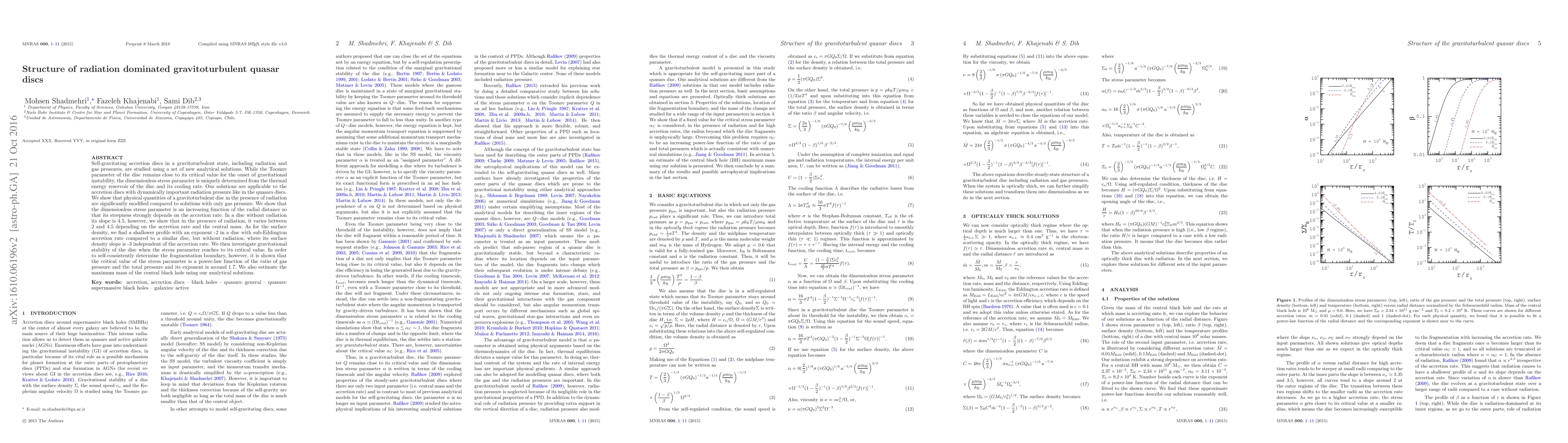 This paper presents new analytical solutions for self-gravitating gravitoturbulent accretion discs in quasars, where radiation pressure plays a significant role. The study reveals that the dimensionless stress parameter varies between 2 and 4.5 with the accretion rate and central mass, significantly altering physical quantities compared to discs with only gas pressure.