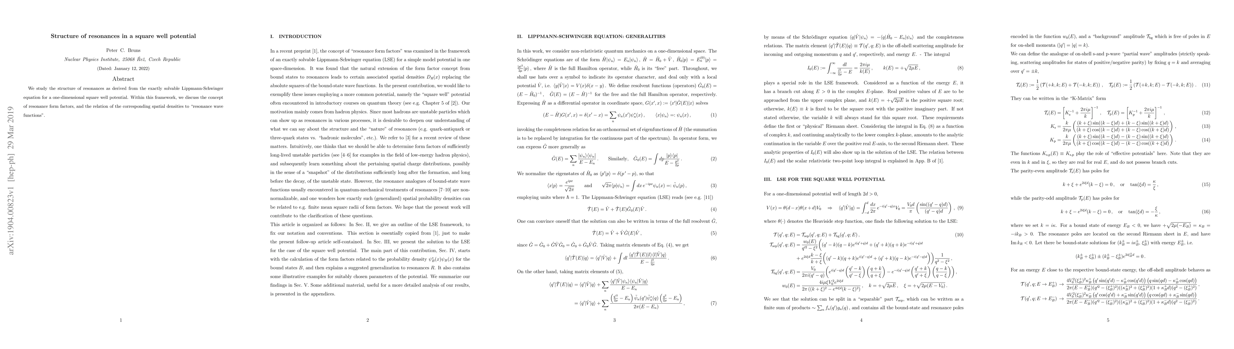 This research explores the structure of resonances in a one-dimensional square well potential using the Lippmann-Schwinger equation, focusing on resonance form factors and the connection between spatial densities and resonance wave functions.