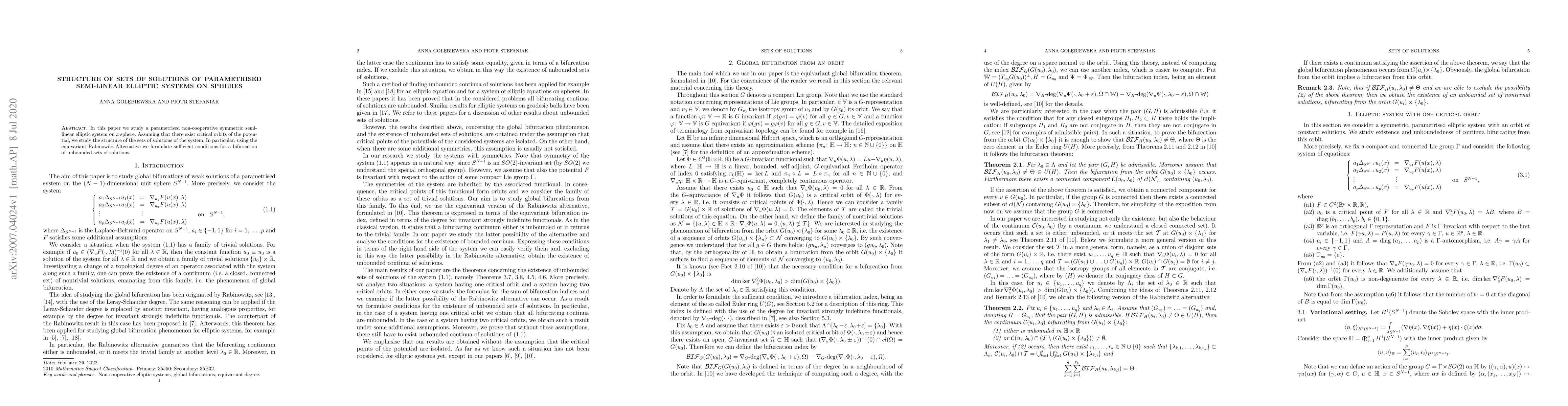 This paper investigates the structure of solutions for a parametrised semi-linear elliptic system on a sphere, focusing on the bifurcation of unbounded solution sets using the equivariant Rabinowitz Alternative under the assumption of critical orbits of the potential.