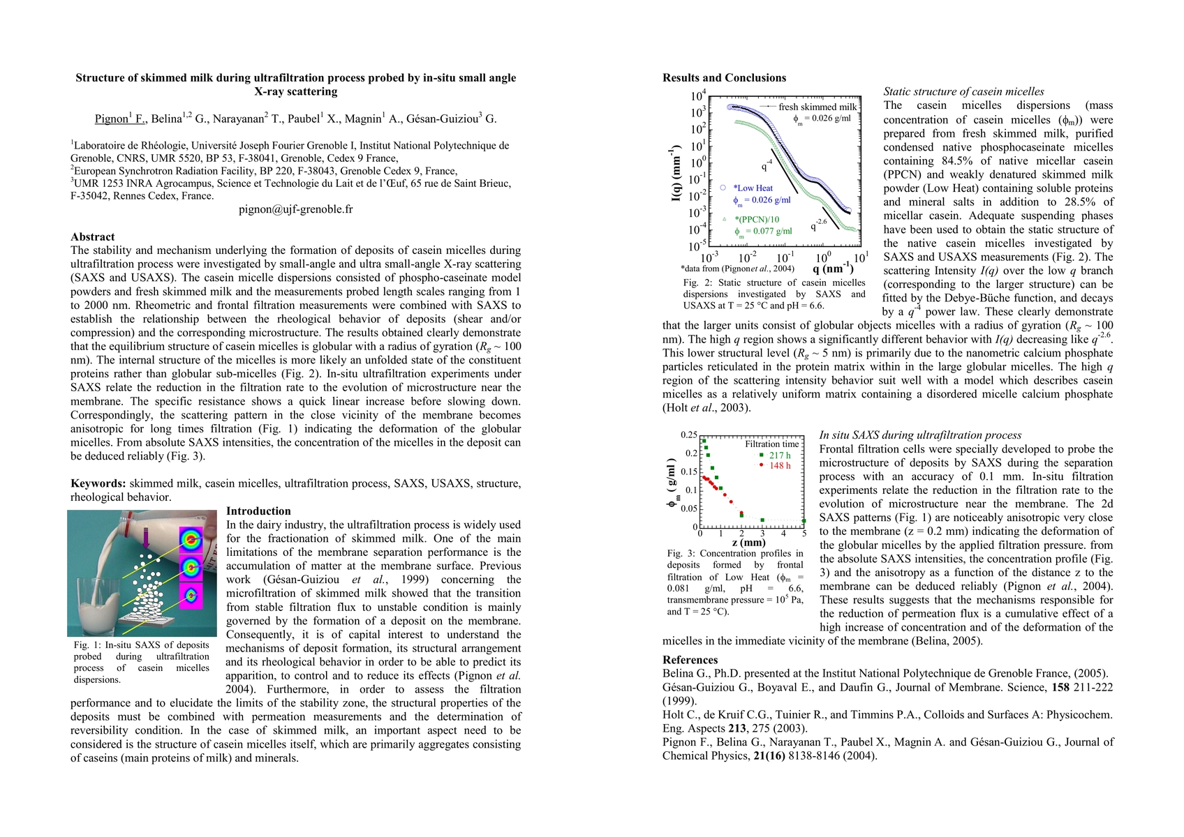 The stability and mechanism underlying the formation of deposits of casein micelles during ultrafiltration process were investigated by small-angle (SAXS) and ultra small-angle X-ray scattering(USAXS) which allowed us to probe the structure of skimmed milk on an exceptionally wide range of length scales from 1 to 2000 nm. Frontal filtration cells were specially developed to probe the microstructure of deposits by SAXS during the separation process. The results revealed two characteristic length scales for the equilibrium structure with radius of gyrations Rg, about 100 nm and 5.6 nm, pertaining to the globular micelles and their non-globular internal structure respectively (Pignon et al. 2004). In-situ scattering measurements showed that the decrease of permeation flows is directly related to the deformation and compression of the micelles in the immediate vicinity of the membrane (figure 1). From absolute SAXS intensities, the concentration of the micelles in the deposit can be deduced reliably.