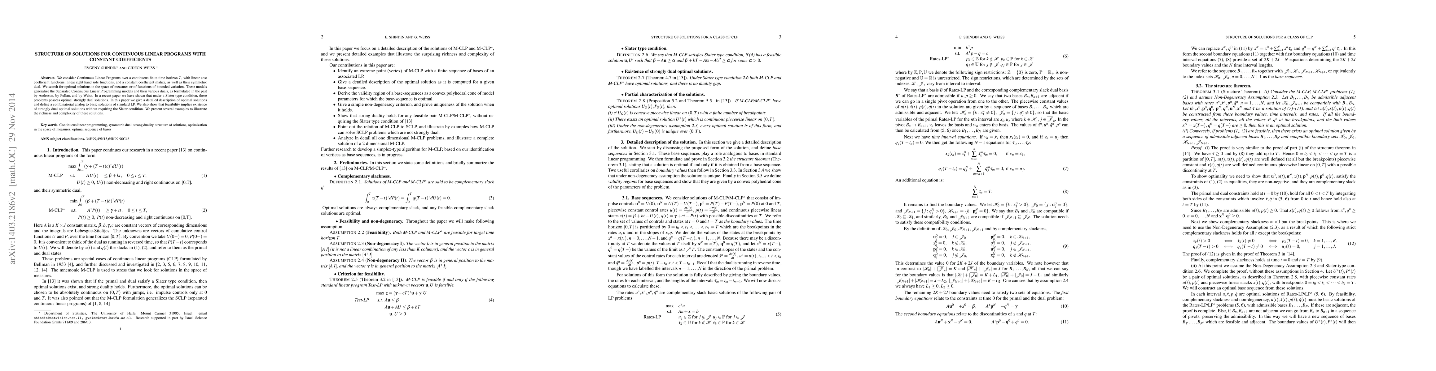 This paper explores optimal solutions for Continuous Linear Programs with constant coefficients, detailing their structure and properties. It establishes a combinatorial analog to basic solutions of standard LP and demonstrates that feasibility alone guarantees the existence of strongly dual optimal solutions, without needing the Slater condition.