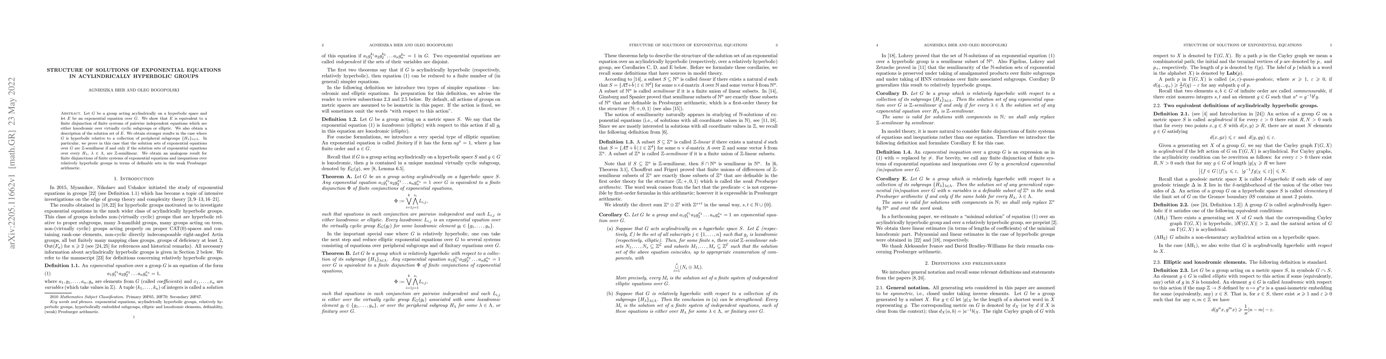 This paper explores the structure of solutions to exponential equations in acylindrically hyperbolic groups, showing they decompose into simpler, independent systems. It further proves that solution sets are $\mathbb{Z}$-semilinear under specific conditions relative to peripheral subgroups.