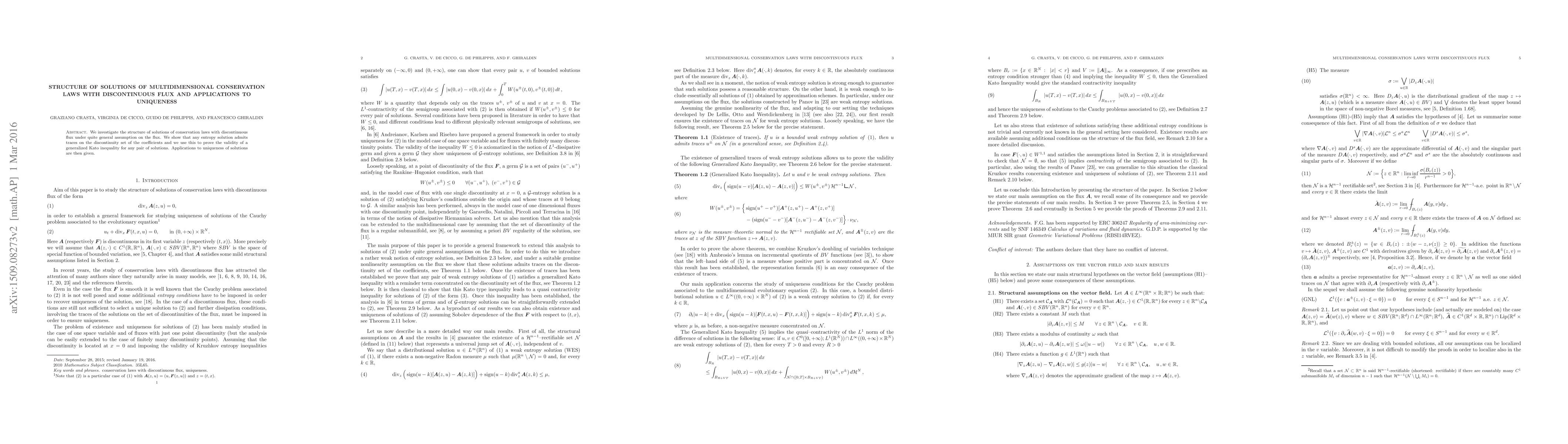 This paper explores the structure of entropy solutions for multidimensional conservation laws with discontinuous flux, demonstrating that these solutions exhibit traces on the discontinuity set. It also proves a generalized Kato inequality for any pair of solutions, leading to a discussion on the uniqueness of such solutions.