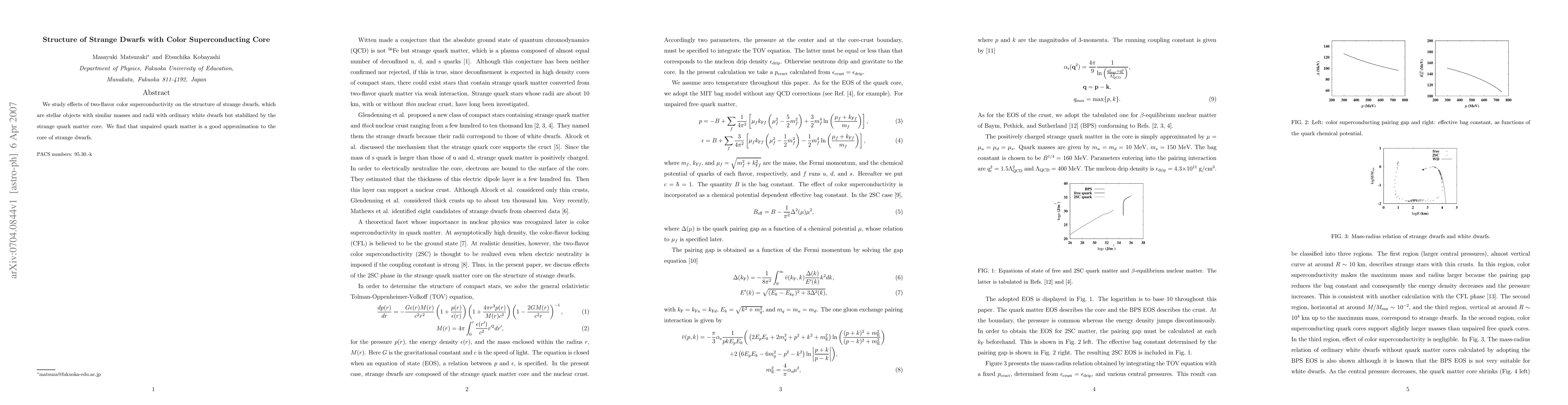 Summary: This research investigates the impact of two-flavor color superconductivity on strange dwarfs, finding that unpaired quark matter effectively approximates the core of these quark-matter-stabilized stellar objects, similar in mass and radius to ordinary white dwarfs.