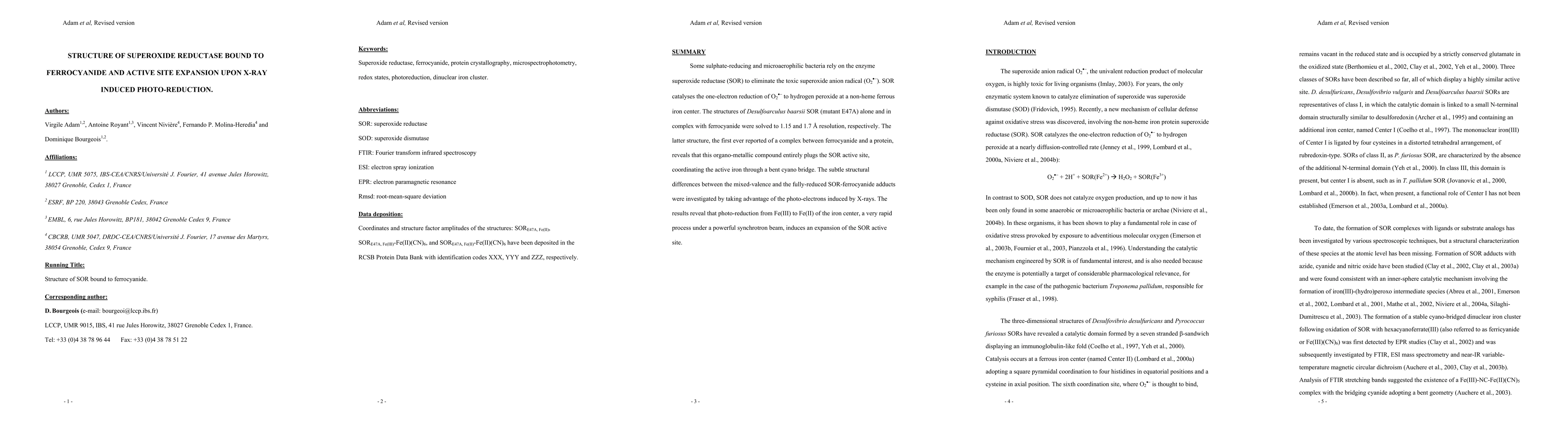 Some sulfate-reducing and microaerophilic bacteria rely on the enzyme superoxide reductase (SOR) to eliminate the toxic superoxide anion radical (O2*-). SOR catalyses the one-electron reduction of O2*- to hydrogen peroxide at a nonheme ferrous iron center. The structures of Desulfoarculus baarsii SOR (mutant E47A) alone and in complex with ferrocyanide were solved to 1.15 and 1.7 A resolution, respectively. The latter structure, the first ever reported of a complex between ferrocyanide and a protein, reveals that this organo-metallic compound entirely plugs the SOR active site, coordinating the active iron through a bent cyano bridge. The subtle structural differences between the mixed-valence and the fully reduced SOR-ferrocyanide adducts were investigated by taking advantage of the photoelectrons induced by X-rays. The results reveal that photo-reduction from Fe(III) to Fe(II) of the iron center, a very rapid process under a powerful synchrotron beam, induces an expansion of the SOR active site.