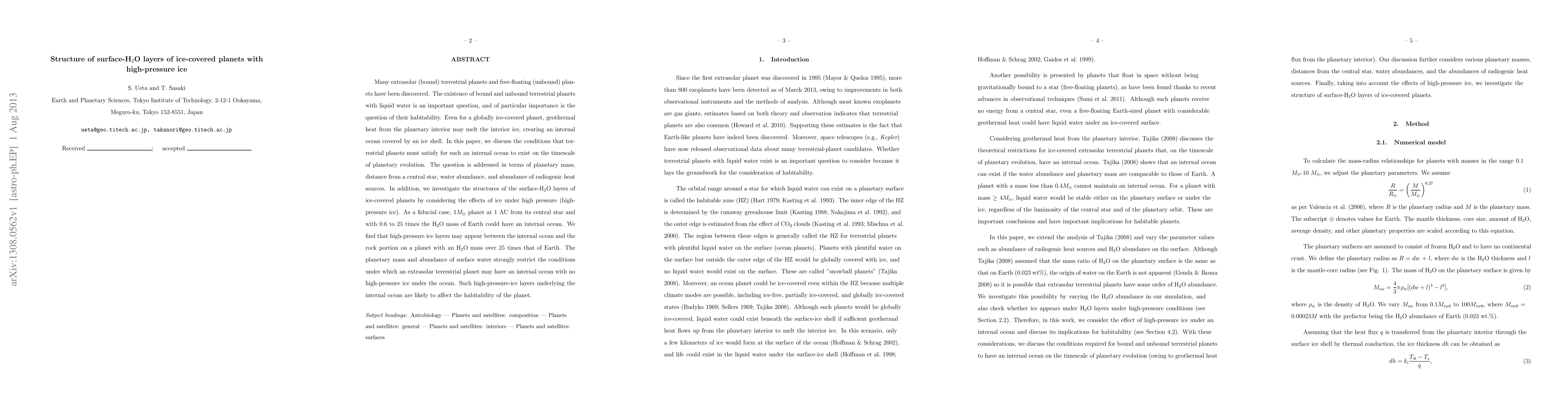 This paper explores the conditions for the existence of internal oceans on ice-covered terrestrial planets, focusing on the influence of planetary mass, distance from a star, water abundance, and radiogenic heat. It finds that high-pressure ice layers may form under certain conditions, potentially affecting the planet's habitability.