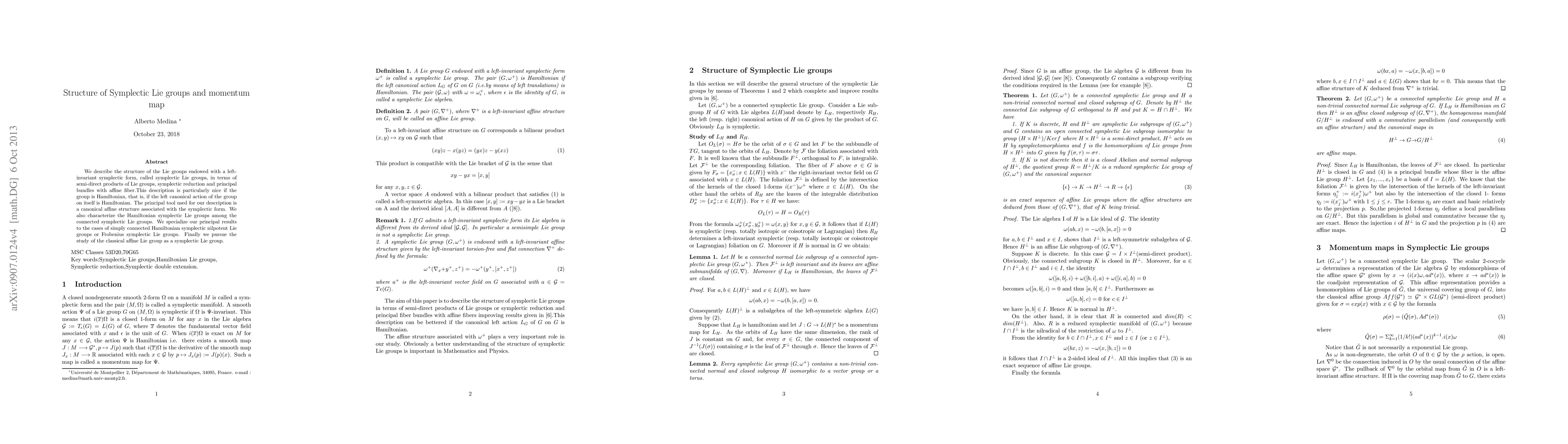 We describe the structure of the Lie groups endowed with a left-invariant symplectic form, called symplectic Lie groups, in terms of semi-direct products of Lie groups, symplectic reduction and principal bundles with affine fiber. This description is particularly nice if the group is Hamiltonian, that is, if the left canonical action of the group on itself is Hamiltonian. The principal tool used for our description is a canonical affine structure associated with the symplectic form. We also characterize the Hamiltonian symplectic Lie groups among the connected symplectic Lie groups. We specialize our principal results to the cases of simply connected Hamiltonian symplectic nilpotent Lie groups or Frobenius symplectic Lie groups. Finally we pursue the study of the classical affine Lie group as a symplectic Lie group. MSC Classes 53D20,70G65 Key words:Symplectic Lie groups,Hamiltonian Lie groups, Symplectic reduction,Symplectic double extension.