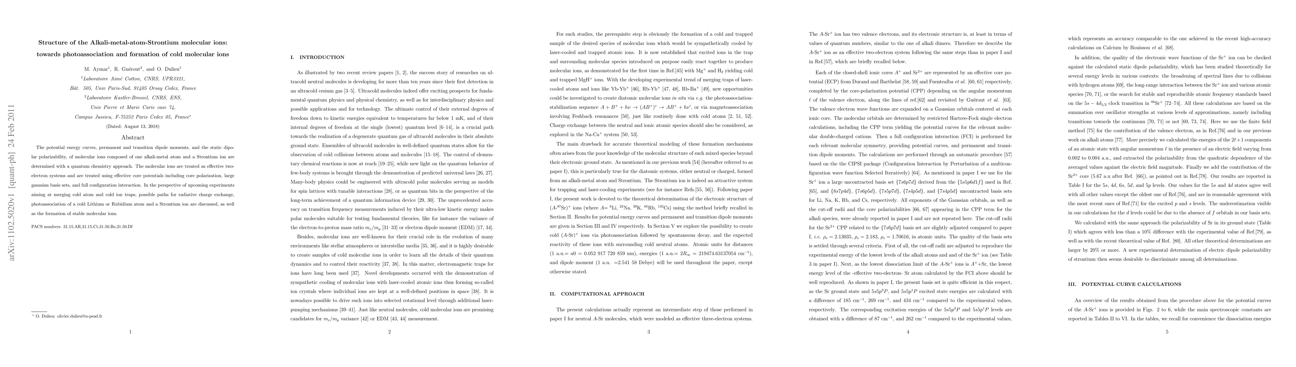 The potential energy curves, permanent and transition dipole moments, and the static dipolar polarizability, of molecular ions composed of one alkali-metal atom and a Strontium ion are determined with a quantum chemistry approach. The molecular ions are treated as effective two-electron systems and are treated using effective core potentials including core polarization, large gaussian basis sets, and full configuration interaction. In the perspective of upcoming experiments aiming at merging cold atom and cold ion traps, possible paths for radiative charge exchange, photoassociation of a cold Lithium or Rubidium atom and a Strontium ion are discussed, as well as the formation of stable molecular ions.