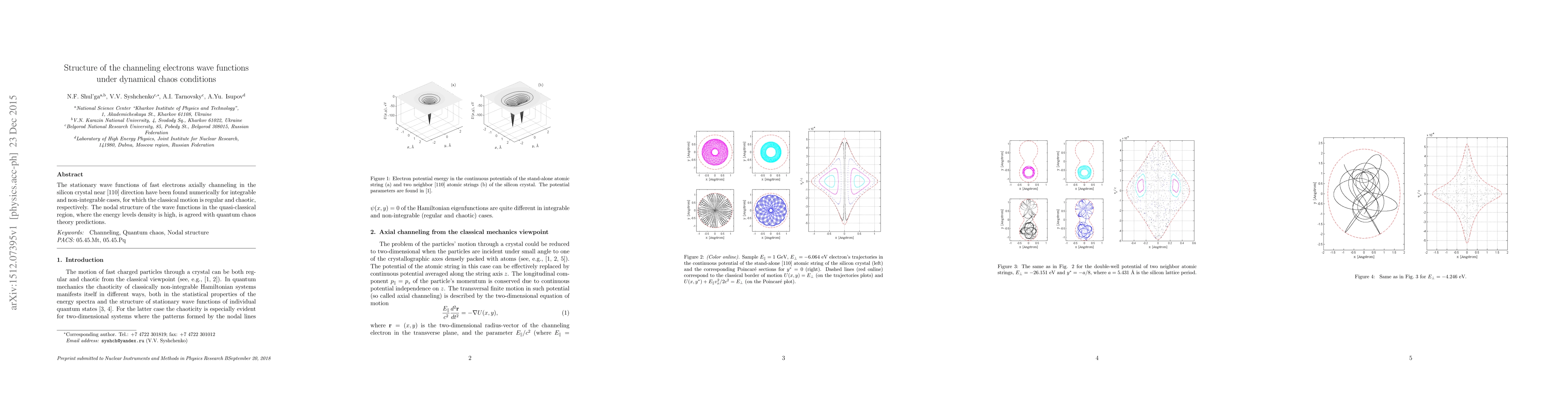This study numerically identifies stationary wave functions of fast electrons traveling along the [110] axis in a silicon crystal, comparing integrable (regular motion) and non-integrable (chaotic motion) cases. The nodal structure of wave functions in high-density energy regions aligns with quantum chaos theory predictions.